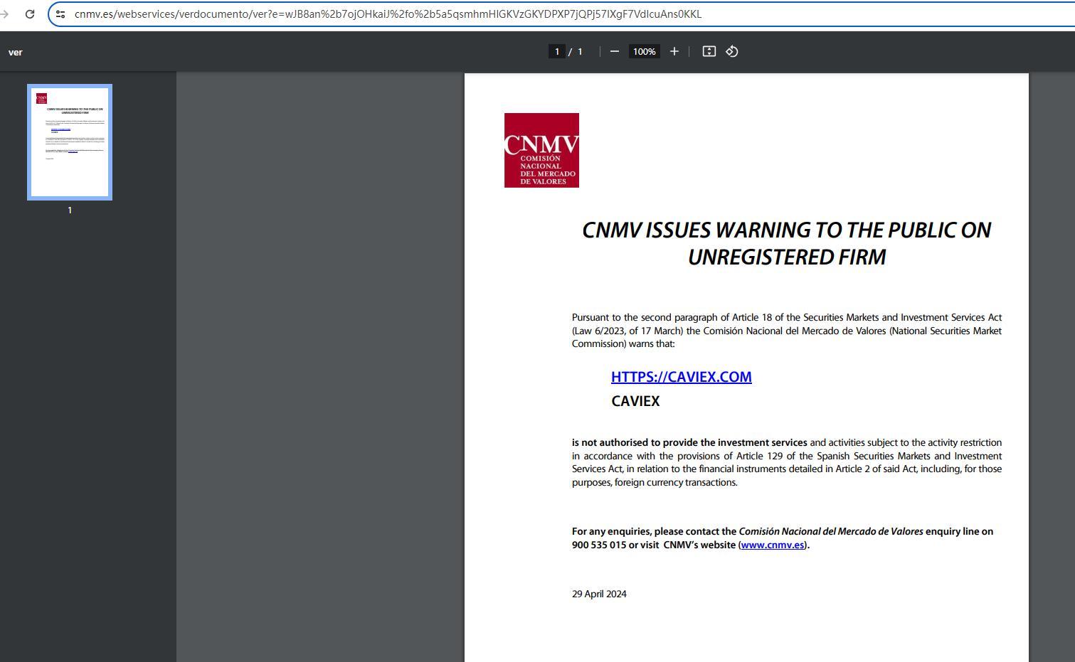 CNMV ने अपंजीकृत फर्म के बारे में जनता को चेतावनी जारी की प्रतिभूति बाजार और निवेश सेवा अधिनियम (कानून 6/2023, 17 मार्च) के अनुच्छेद 18 के दूसरे पैराग्राफ के अनुसार, कोमिसियोन नैशनल डेल मर्काडो डे वेलोरेस (राष्ट्रीय प्रतिभूति बाजार आयोग) चेतावनी देता है कि: HTTPS://CAVIEX.COM CAVIEX को स्पेनिश प्रतिभूति बाजार और निवेश सेवा अधिनियम के अनुच्छेद 129 के प्रावधानों के अनुसार गतिविधि प्रतिबंध के अधीन निवेश सेवाएं और गतिविधियाँ प्रदान करने के लिए अधिकृत नहीं किया गया है, उक्त अधिनियम के अनुच्छेद 2 में वर्णित वित्तीय साधनों के संबंध में, उन उद्देश्यों के लिए, विदेशी मुद्रा लेनदेन सहित। किसी भी पूछताछ के लिए, कृपया 900 535 015 पर कोमिसियोन नैशनल डेल मर्काडो डे वेलोरेस पूछताछ लाइन से संपर्क करें या CNMV की वेबसाइट (www.cnmv.es) पर जाएँ। 29 अप्रैल 2024