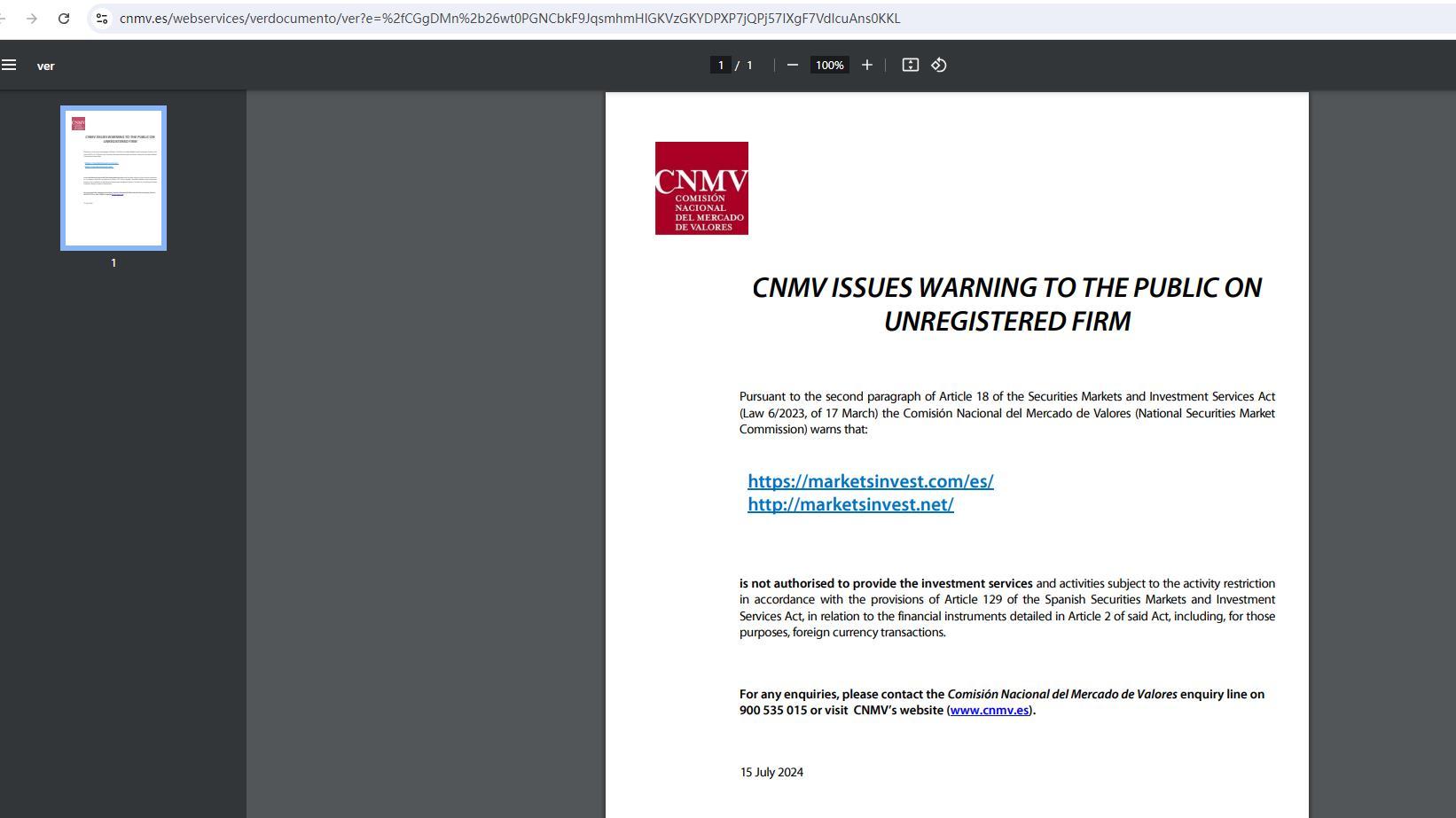 CNMV ने अपंजीकृत फर्म के बारे में जनता को चेतावनी जारी की प्रतिभूति बाजार और निवेश सेवा अधिनियम (कानून 6/2023, 17 मार्च) के अनुच्छेद 18 के दूसरे पैराग्राफ के अनुसार, कोमिसियोन नैशनल डेल मर्काडो डे वेलोरेस (राष्ट्रीय प्रतिभूति बाजार आयोग) चेतावनी देता है कि: https://marketsinvest.com/es/ http://marketsinvest.net/ स्पेनिश प्रतिभूति बाजार और निवेश सेवा अधिनियम के अनुच्छेद 129 के प्रावधानों के अनुसार गतिविधि प्रतिबंध के अधीन निवेश सेवाएं और गतिविधियां प्रदान करने के लिए अधिकृत नहीं है, उक्त अधिनियम के अनुच्छेद 2 में वर्णित वित्तीय साधनों के संबंध में, उन उद्देश्यों के लिए, विदेशी मुद्रा लेनदेन सहित। किसी भी पूछताछ के लिए, कृपया 900 535 015 पर कोमिसियोन नैशनल डेल मर्काडो डे वेलोरेस पूछताछ लाइन से संपर्क करें या CNMV की वेबसाइट (www.cnmv.es) पर जाएँ। 15 जुलाई 2024