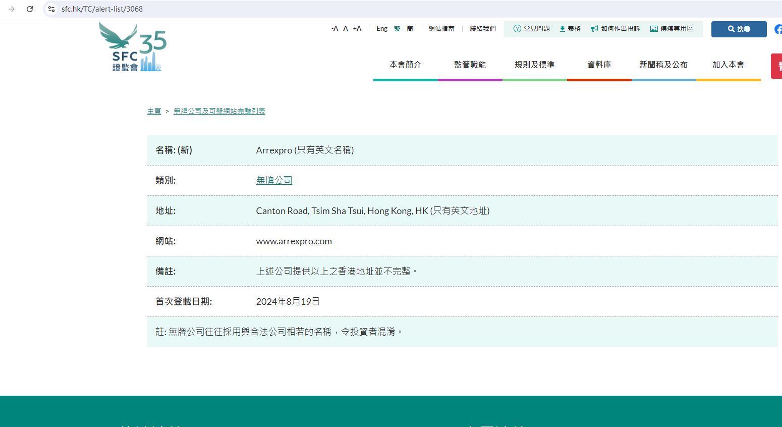 बिना लाइसेंस वाली कंपनियों और संदिग्ध वेबसाइटों की सूची में उन कंपनियों को सूचीबद्ध किया गया है जिनके पास हांगकांग में लाइसेंस नहीं है और जिन्होंने एसएफसी का ध्यान आकर्षित किया है। संदेह है कि ये कंपनियाँ वर्तमान में या तो हांगकांग के निवेशकों को निशाना बना रही हैं, या हांगकांग से संबंध रखने का दावा कर रही हैं। आप यह जांचने के लिए नाम या श्रेणी से खोज सकते हैं कि कोई कंपनी सूची में शामिल है या नहीं। यह सूची व्यापक नहीं है। चूंकि प्रतिभूति और वायदा आयोग अक्सर ध्यान देने योग्य कंपनियों या वेबसाइटों की खोज करता है, हम समय-समय पर सूची में नए नाम जोड़ेंगे। यदि किसी बिना लाइसेंस वाली कंपनी ने आपसे संपर्क किया है, तो कृपया हमारे ऑनलाइन शिकायत फ़ॉर्म का उपयोग करें। बॉयलर रूम, धोखाधड़ी वाली वेबसाइटों और फर्जी ईमेल के बारे में अधिक जानकारी के लिए कृपया संबंधित लिंक पर क्लिक करें। नोट: बिना लाइसेंस वाली कंपनियों और संदिग्ध वेबसाइटों की सूची का उद्देश्य निवेशकों को यथाशीघ्र सचेत करना है। निवेशकों को केवल उपरोक्त सूची की जानकारी पर भरोसा नहीं करना चाहिए और स्वयं व्यक्तिगत कंपनियों के विवरण की सावधानीपूर्वक जांच करनी चाहिए। कृपया सूची देखने के लिए प्रत्येक कॉलम में नाम का पहला अंग्रेजी अक्षर चुनें, या केवल चीनी नाम वाली कंपनियों को देखने के लिए "चीनी नाम" कॉलम पर क्लिक करें। नाम: (नया) Arrexpro (केवल अंग्रेजी नाम) श्रेणी: बिना लाइसेंस वाली कंपनी का पता: कैंटन रोड, त्सिम शा त्सुई, हांगकांग, हांगकांग (केवल अंग्रेजी पता) वेबसाइट: www। Arrexpro .com नोट: उपरोक्त कंपनी द्वारा प्रदान किया गया हांगकांग का उपरोक्त पता अधूरा है। पहली बार प्रकाशित होने की तिथि: 19 अगस्त, 2024 नोट: बिना लाइसेंस वाली कंपनियां अक्सर निवेशकों को भ्रमित करते हुए कानूनी कंपनियों के समान नामों का उपयोग करती हैं।