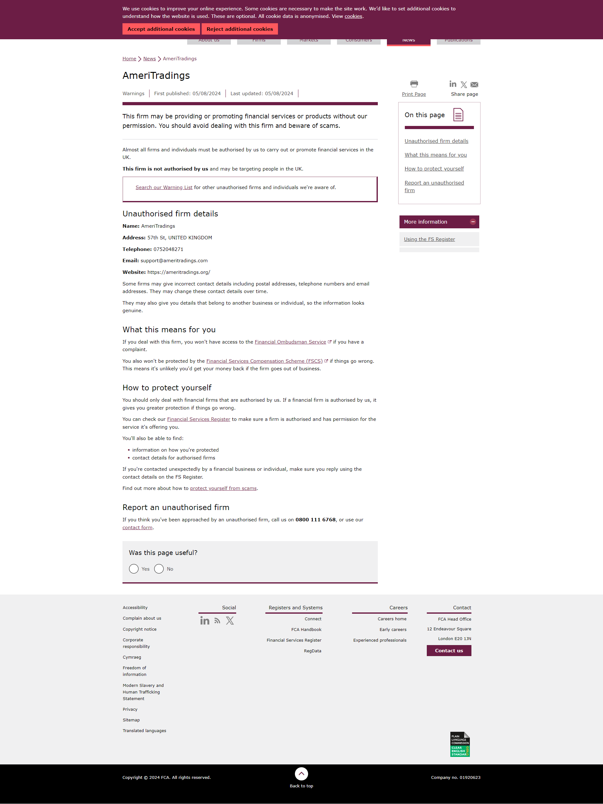 FCA की अनधिकृत फर्मों की चेतावनी सूची AmeriTradings.