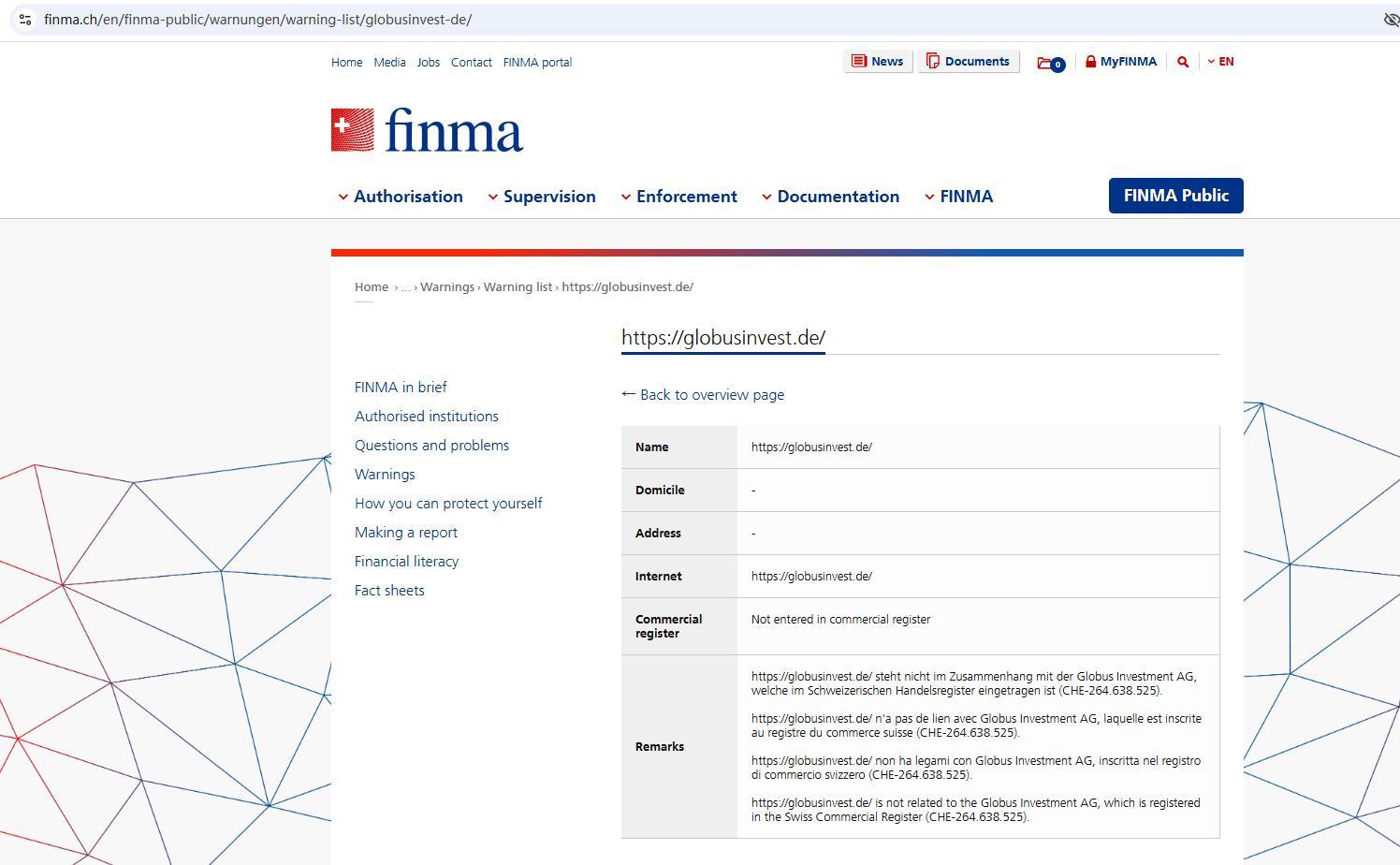 अनधिकृत कंपनियों और व्यक्तियों की चेतावनी सूची चेतावनी सूची - https://globusinvest.de/.
