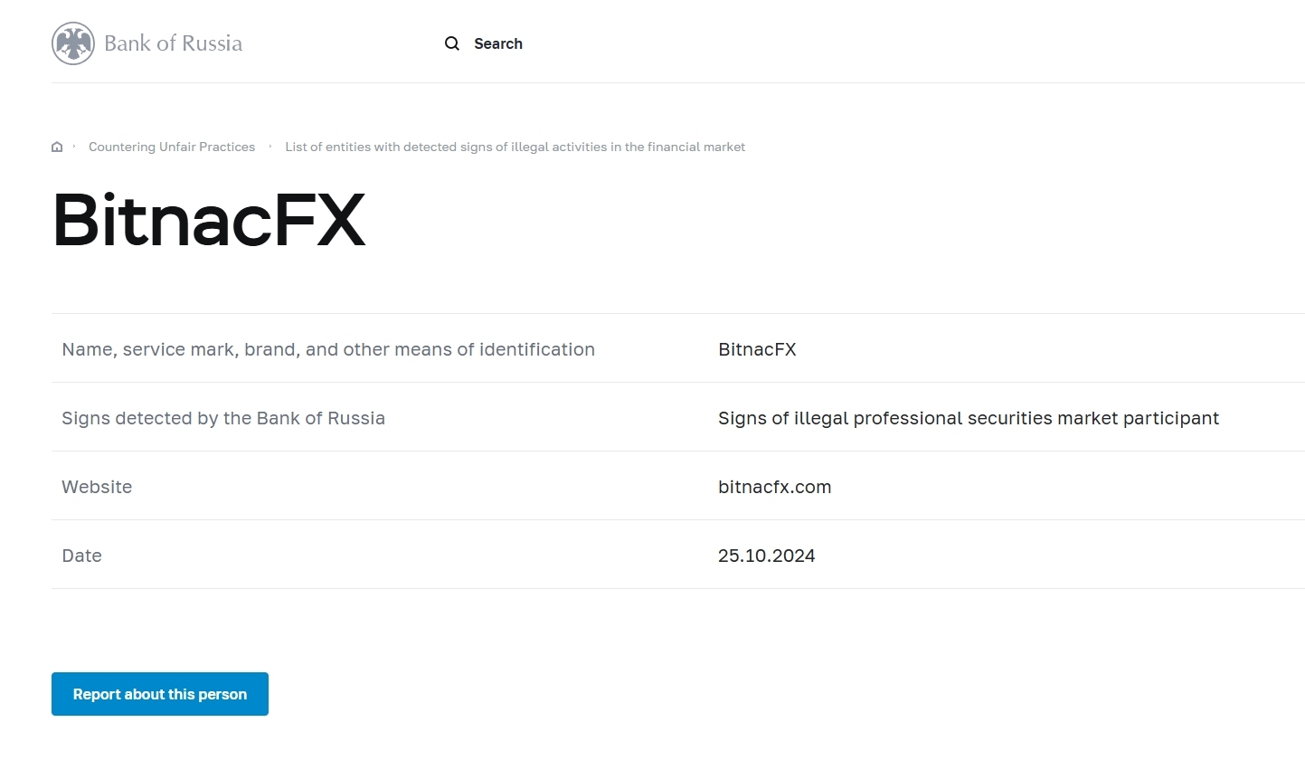 नाम, सेवा चिह्न, ब्रांड और पहचान के अन्य साधन BitnacFX बैंक ऑफ रूस द्वारा अवैध पेशेवर प्रतिभूति बाजार प्रतिभागी वेबसाइट के संकेत पाए गए BitnacFX .com दिनांक 25.10.2024