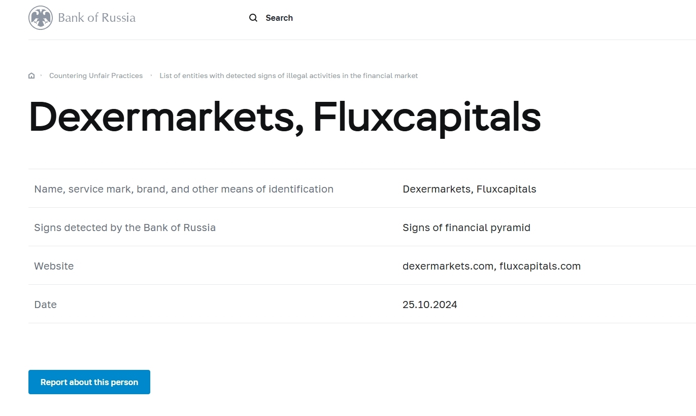 नाम, सेवा चिह्न, ब्रांड और पहचान के अन्य साधन dexermarkets , फ्लक्सकैपिटल्स बैंक ऑफ रूस द्वारा वित्तीय पिरामिड वेबसाइट के संकेतों का पता लगाया गया dexermarkets .com, fluxcapitals.com दिनांक 25.10.2024