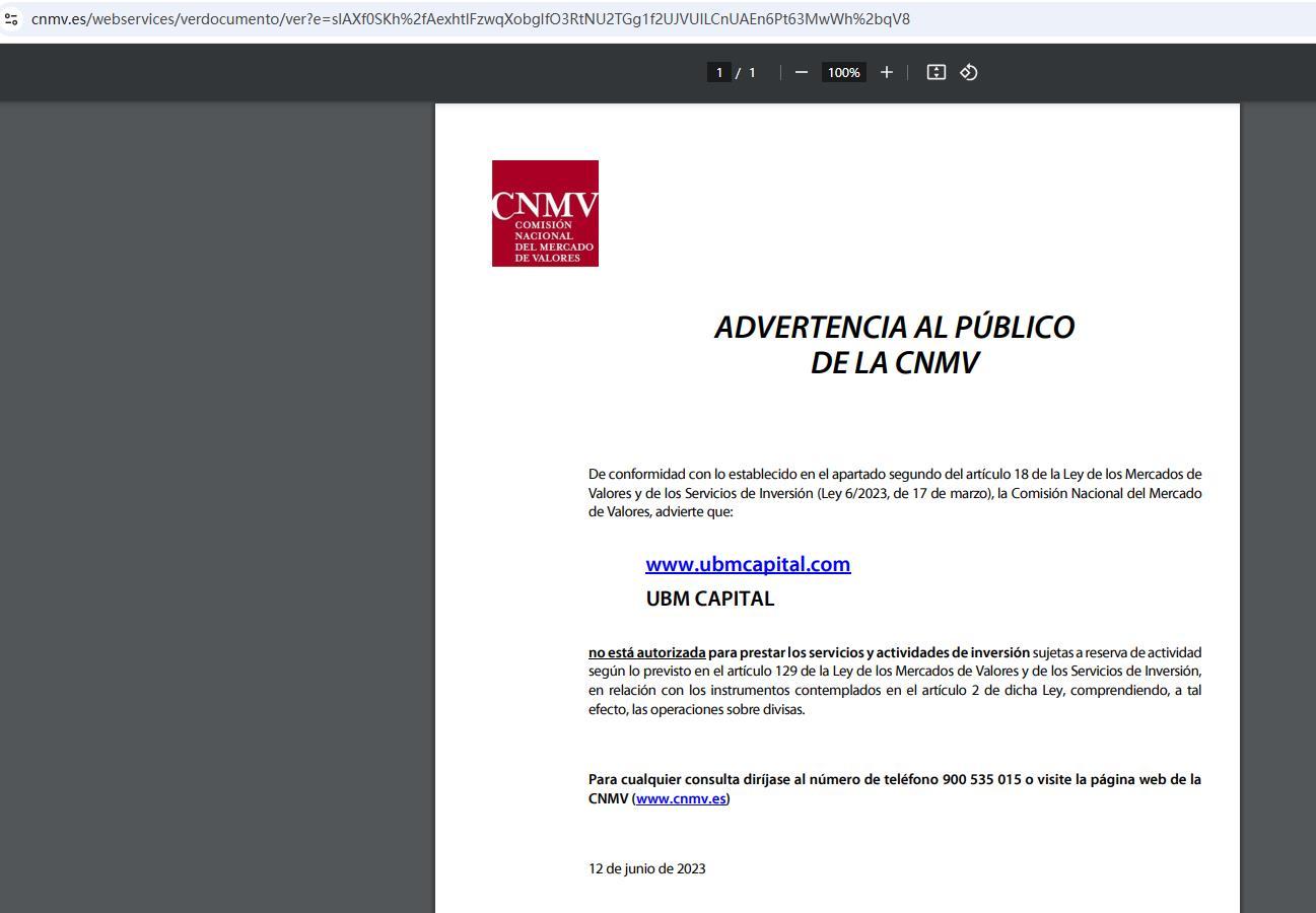 सीएनएमवी की ओर से जनता को चेतावनी प्रतिभूति बाजार और निवेश सेवाओं पर कानून के अनुच्छेद 18 के दूसरे खंड के प्रावधानों के अनुसार (कानून 6/2023, 17 मार्च), राष्ट्रीय प्रतिभूति बाजार आयोग चेतावनी देता है कि: www. UBMCapital .com यूबीएम कैपिटल प्रतिभूति बाजार और निवेश सेवाओं पर कानून के अनुच्छेद 129 में प्रावधानित गतिविधि के आरक्षण के अधीन निवेश सेवाएं और गतिविधियां प्रदान करने के लिए अधिकृत नहीं है, उक्त कानून के अनुच्छेद 2 में निर्दिष्ट उपकरणों के संबंध में, जिसमें इस उद्देश्य के लिए विदेशी मुद्रा लेनदेन भी शामिल है। किसी भी प्रश्न के लिए, कृपया 900 535 015 पर कॉल करें या CNMV वेबसाइट (www.cnmv.es) पर जाएं 12 जून, 2023