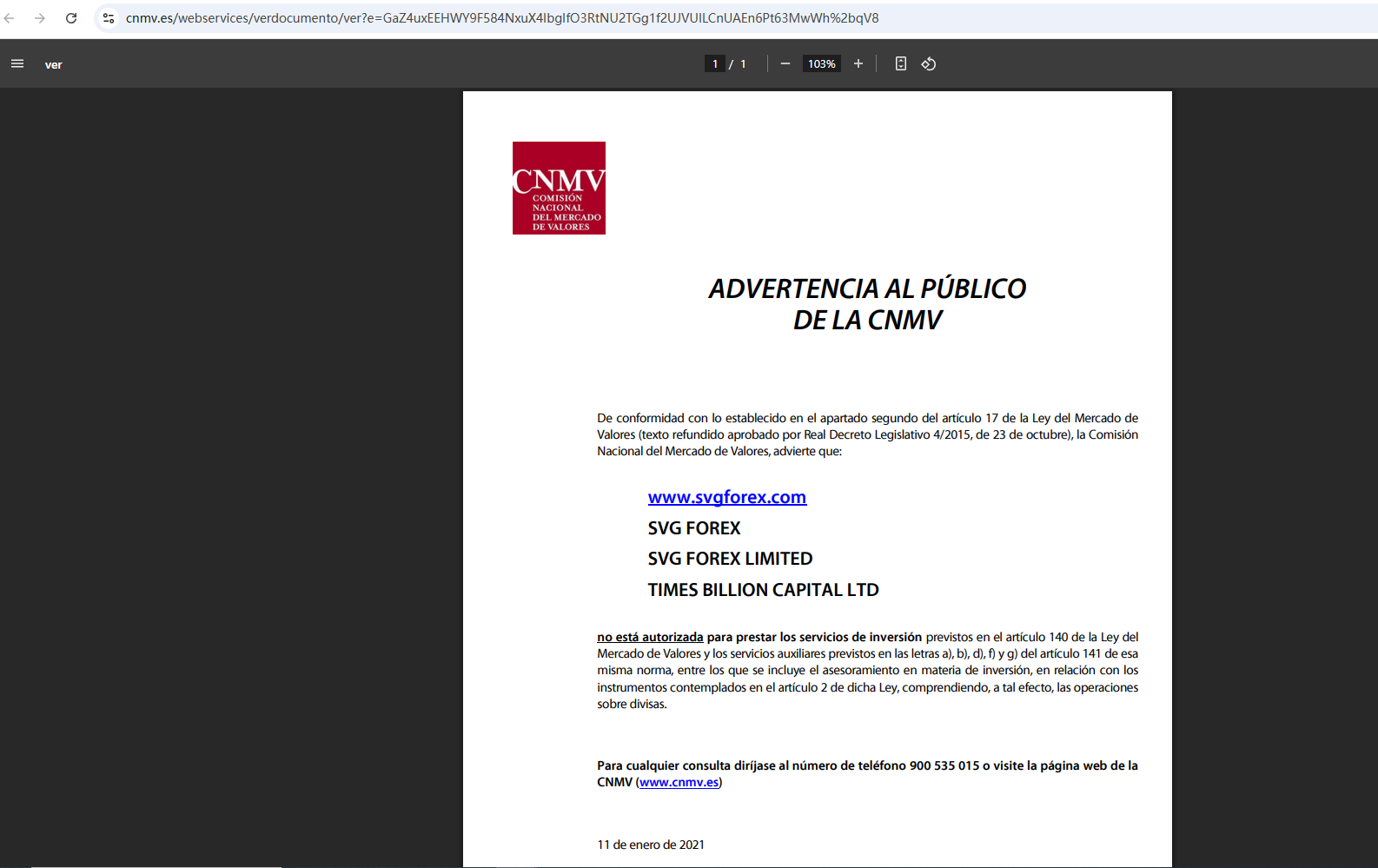 सीएनएमवी की ओर से सार्वजनिक सूचना, प्रतिभूति बाजार कानून के अनुच्छेद 17 के दूसरे खंड के प्रावधानों के अनुसार (23 अक्टूबर के रॉयल लेजिस्लेटिव डिक्री 4/2015 द्वारा अनुमोदित समेकित पाठ), राष्ट्रीय प्रतिभूति बाजार आयोग चेतावनी देता है कि: www.svgforex.com SVG Forex SVG Forex सीमित Times Billion Capital LTD यह प्रतिभूति बाजार कानून के अनुच्छेद 140 में प्रदत्त निवेश सेवाएं तथा उसी कानून के अनुच्छेद 141 के अक्षर a), b), d), f) और g) में प्रदत्त सहायक सेवाएं प्रदान करने के लिए अधिकृत नहीं है, जिसमें उक्त कानून के अनुच्छेद 2 में परिकल्पित उपकरणों के संबंध में निवेश सलाह शामिल है, जिसमें इस प्रयोजन के लिए मुद्रा लेनदेन भी शामिल है। किसी भी प्रश्न के लिए, कृपया 900 535 015 पर कॉल करें या CNMV वेबसाइट (www.cnmv.es) पर जाएं 11 जनवरी, 2021.