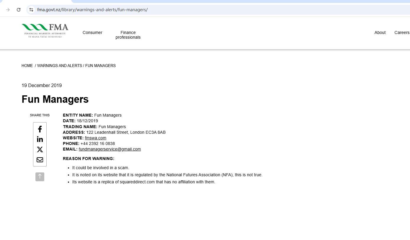 • सजा का कारण यह किसी घोटाले में शामिल हो सकता है। इसकी वेबसाइट पर उल्लेख किया गया है कि यह नेशनल फ्यूचर्स एसोसिएशन (NFA) द्वारा विनियमित है, यह सच नहीं है। इसकी वेबसाइट squareddirect.com की प्रतिकृति है जिसका उनसे कोई संबंध नहीं है।