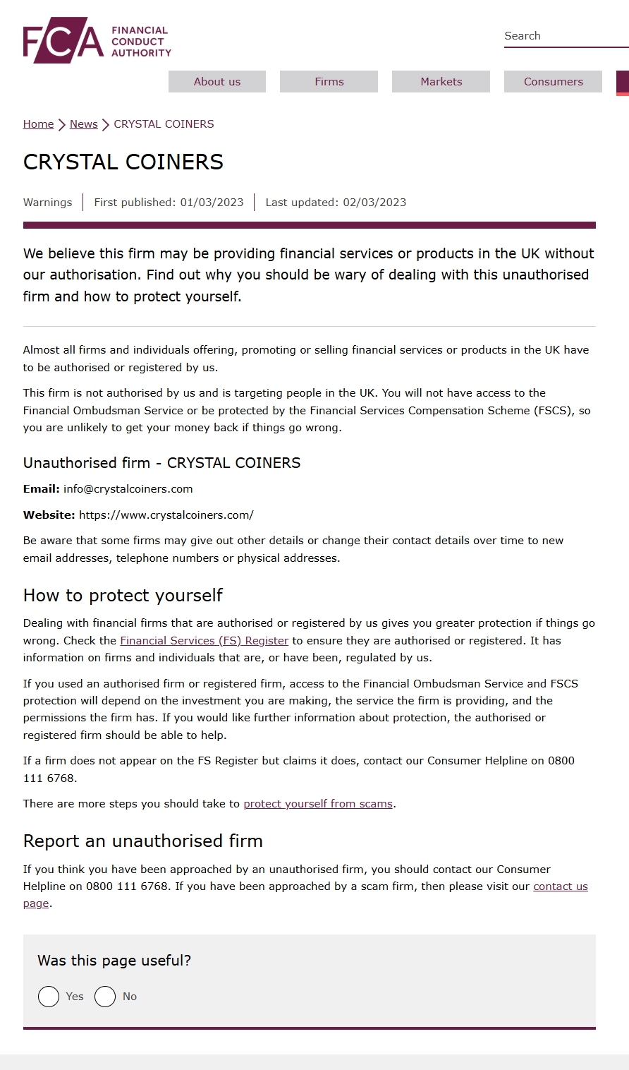 एफसीए की अनधिकृत फर्मों की चेतावनी सूची क्रिस्टल कोइनर्स.
