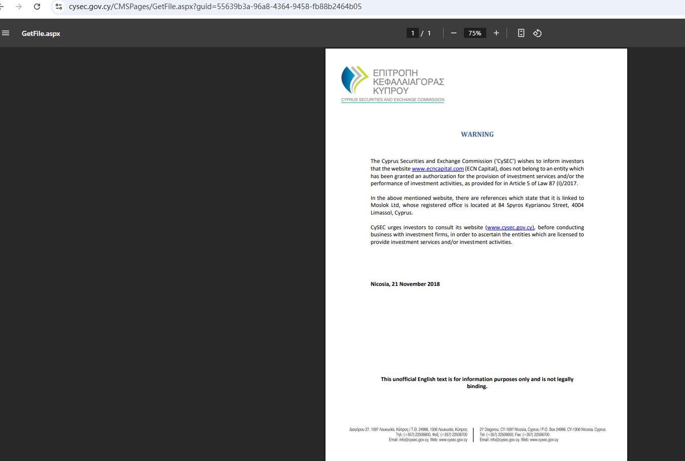 • सजा का कारण साइप्रस प्रतिभूति और विनिमय आयोग ('साइसेक') निवेशकों को सूचित करना चाहता है कि वेबसाइट www.ecncapital.com ( ECN Capital ), किसी ऐसी इकाई से संबंधित नहीं है जिसे निवेश सेवाओं के प्रावधान और/या निवेश गतिविधियों के निष्पादन के लिए प्राधिकरण प्रदान किया गया हो।