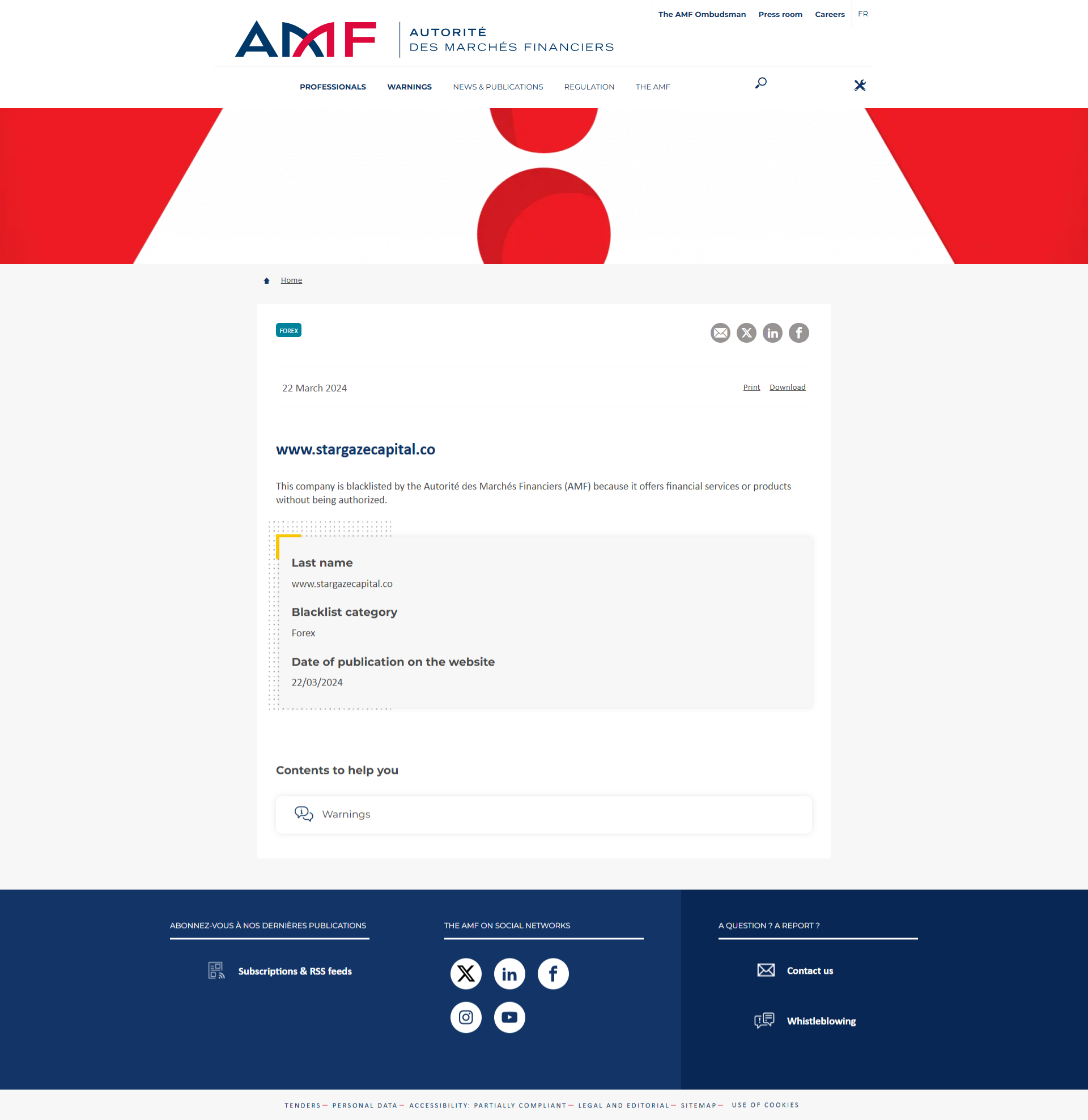 www.stargazecapital.co इस कंपनी को ऑटोरिटे डेस मार्चेस फाइनेंसर्स (AMF) द्वारा ब्लैकलिस्ट किया गया है क्योंकि यह अधिकृत किए बिना वित्तीय सेवाएँ या उत्पाद प्रदान करती है। अंतिम नाम www.stargazecapital.co ब्लैकलिस्ट श्रेणी फ़ॉरेक्स वेबसाइट पर प्रकाशन की तिथि 22/03/2024.