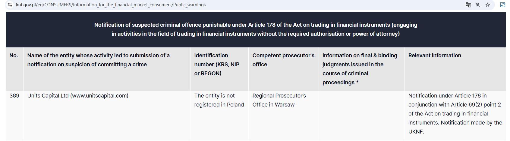 Units Capitalलिमिटेड (www.unitscapital.com) इकाई वारसॉ में पोलैंड क्षेत्रीय अभियोजक के कार्यालय में पंजीकृत नहीं है वित्तीय साधनों में व्यापार पर अधिनियम के अनुच्छेद 69 (2) बिंदु 2 के साथ अनुच्छेद 178 के तहत अधिसूचना। यूकेएनएफ द्वारा की गई अधिसूचना।