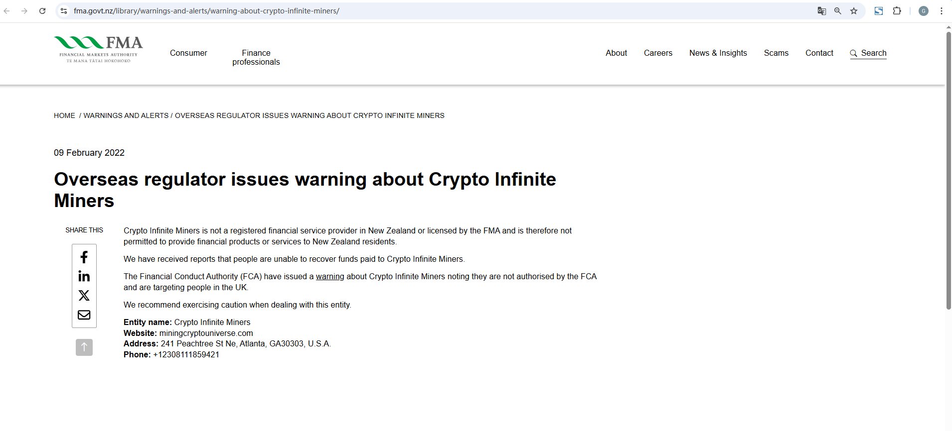 09 फरवरी 2022 विदेशी विनियामक ने क्रिप्टो इनफिनिट माइनर्स के बारे में चेतावनी जारी की इसे साझा करें क्रिप्टो इनफिनिट माइनर्स न्यूज़ीलैंड में पंजीकृत वित्तीय सेवा प्रदाता नहीं है या FMA द्वारा लाइसेंस प्राप्त नहीं है और इसलिए उसे न्यूज़ीलैंड के निवासियों को वित्तीय उत्पाद या सेवाएँ प्रदान करने की अनुमति नहीं है। हमें रिपोर्ट मिली हैं कि लोग क्रिप्टो इनफिनिट माइनर्स को भुगतान किए गए धन को वापस पाने में असमर्थ हैं। वित्तीय आचरण प्राधिकरण (FCA) ने क्रिप्टो इनफिनिट माइनर्स के बारे में चेतावनी जारी की है जिसमें कहा गया है कि वे FCA द्वारा अधिकृत नहीं हैं और यूके में लोगों को लक्षित कर रहे हैं। हम इस इकाई के साथ व्यवहार करते समय सावधानी बरतने की सलाह देते हैं। इकाई का नाम: क्रिप्टो इनफिनिट माइनर्स वेबसाइट: miningcryptouniverse.com पता: 241 पीचट्री सेंट ने, अटलांटा, GA30303, USA फ़ोन: +12308111859421