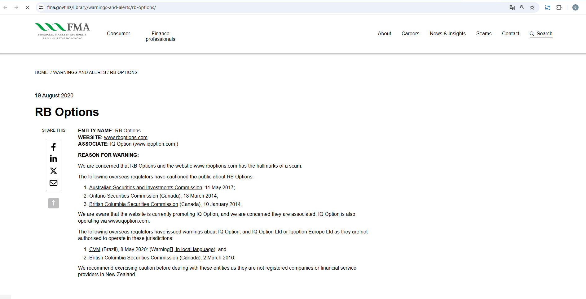 19 अगस्त 2020 आरबी ऑप्शन इस इकाई को साझा करें नाम: आरबी ऑप्शन वेबसाइट: www.rboptions.com सहयोगी: आईक्यू ऑप्शन (www.iqoption.com) चेतावनी का कारण: हमें चिंता है कि आरबी ऑप्शन और वेबसाइट www.rboptions.com में घोटाले के लक्षण हैं। निम्नलिखित विदेशी नियामकों ने आरबी ऑप्शन के बारे में जनता को आगाह किया है: ऑस्ट्रेलियाई प्रतिभूति और निवेश आयोग, 11 मई 2017; ओंटारियो प्रतिभूति आयोग (कनाडा), 18 मार्च 2014; ब्रिटिश कोलंबिया प्रतिभूति आयोग (कनाडा), 10 जनवरी 2014। हमें पता है कि वेबसाइट वर्तमान में आईक्यू ऑप्शन को बढ़ावा दे रही है, और हमें चिंता है कि वे इससे जुड़े हुए हैं। आईक्यू ऑप्शन www.iqoption.com के माध्यम से भी काम कर रहा है। निम्नलिखित विदेशी नियामकों ने आईक्यू ऑप्शन के बारे में चेतावनी जारी की है, और IQ Option LTD या iqoption यूरोप लिमिटेड क्योंकि वे इन अधिकार क्षेत्रों में काम करने के लिए अधिकृत नहीं हैं: सीवीएम (ब्राजील), 8 मई 2020: (स्थानीय भाषा में चेतावनी); और ब्रिटिश कोलंबिया सिक्योरिटीज कमीशन (कनाडा), 2 मार्च 2016। हम इन संस्थाओं के साथ काम करने से पहले सावधानी बरतने की सलाह देते हैं क्योंकि वे न्यूजीलैंड में पंजीकृत कंपनियां या वित्तीय सेवा प्रदाता नहीं हैं।