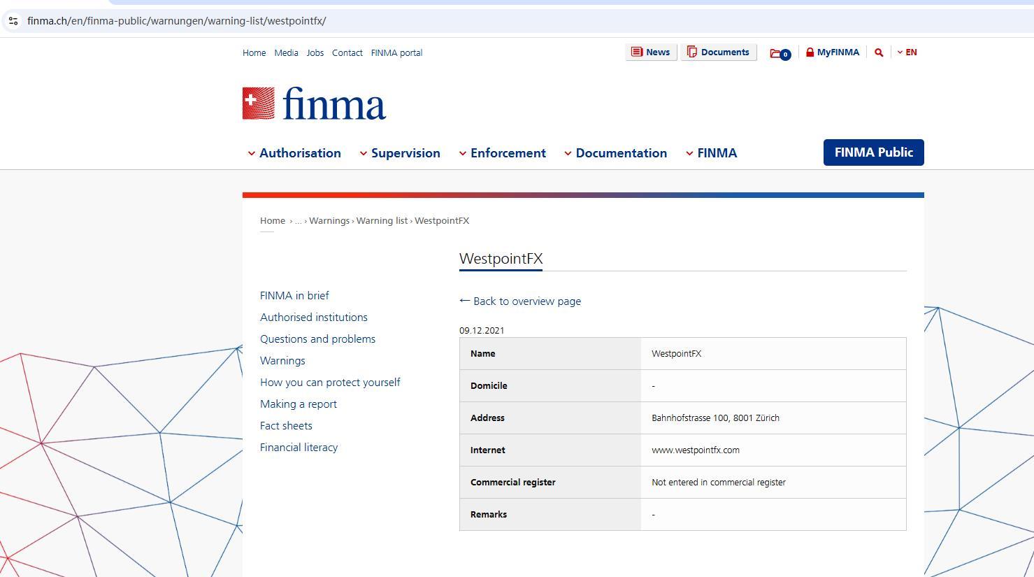अनधिकृत कंपनियों और व्यक्तियों की चेतावनी सूची वेस्टपॉइंटएफएक्स.
