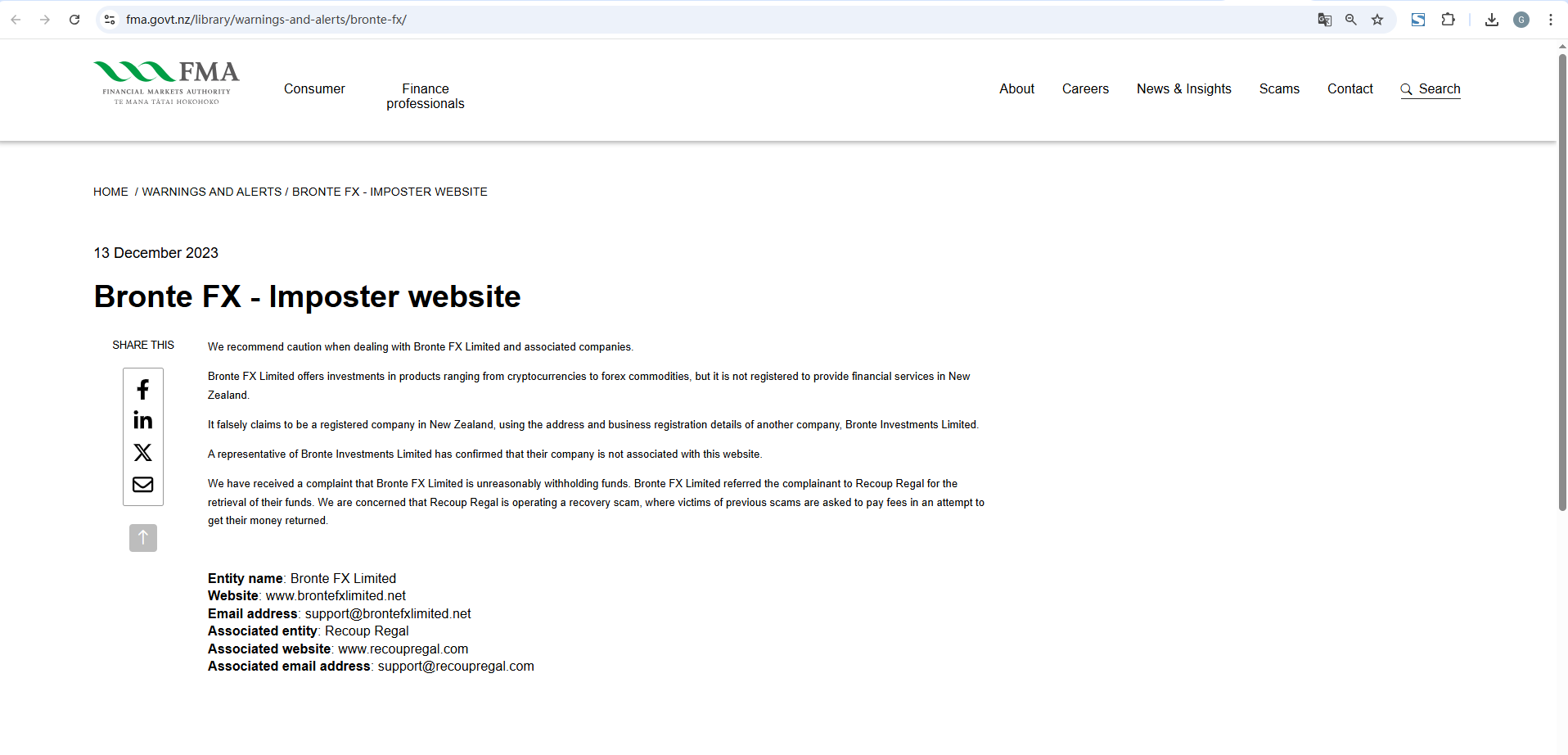 13 दिसंबर 2023 BRONTE FX - धोखेबाज वेबसाइट इसे साझा करें हम इससे निपटने के दौरान सावधानी बरतने की सलाह देते हैं Bronte Fx Limited और संबद्ध कंपनियां। Bronte Fx Limited क्रिप्टोकरेंसी से लेकर विदेशी मुद्रा वस्तुओं तक के उत्पादों में निवेश की पेशकश करता है, लेकिन यह न्यूजीलैंड में वित्तीय सेवाएं प्रदान करने के लिए पंजीकृत नहीं है। यह एक अन्य कंपनी, ब्रोंटे इन्वेस्टमेंट लिमिटेड के पते और व्यवसाय पंजीकरण विवरण का उपयोग करके न्यूजीलैंड में एक पंजीकृत कंपनी होने का झूठा दावा करता है। ब्रोंटे इन्वेस्टमेंट लिमिटेड के एक प्रतिनिधि ने पुष्टि की है कि उनकी कंपनी इस वेबसाइट से जुड़ी नहीं है। हमें एक शिकायत मिली है कि Bronte Fx Limited अनुचित रूप से धनराशि रोक रखी है। Bronte Fx Limited शिकायतकर्ता को उनके धन की वापसी के लिए रीकूप रीगल के पास भेजा गया। हमें चिंता है कि रीकूप रीगल एक वसूली घोटाला संचालित कर रहा है, जहां पिछले घोटाले के पीड़ितों को अपने पैसे वापस पाने के प्रयास में शुल्क का भुगतान करने के लिए कहा जाता है। संस्था का नाम: Bronte Fx Limited वेबसाइट: www.brontefxlimited.net ईमेल पता: support@brontefxlimited.net संबद्ध इकाई: recoup regal संबद्ध वेबसाइट: www.recoupregal.com संबद्ध ईमेल पता: support@recoupregal.com