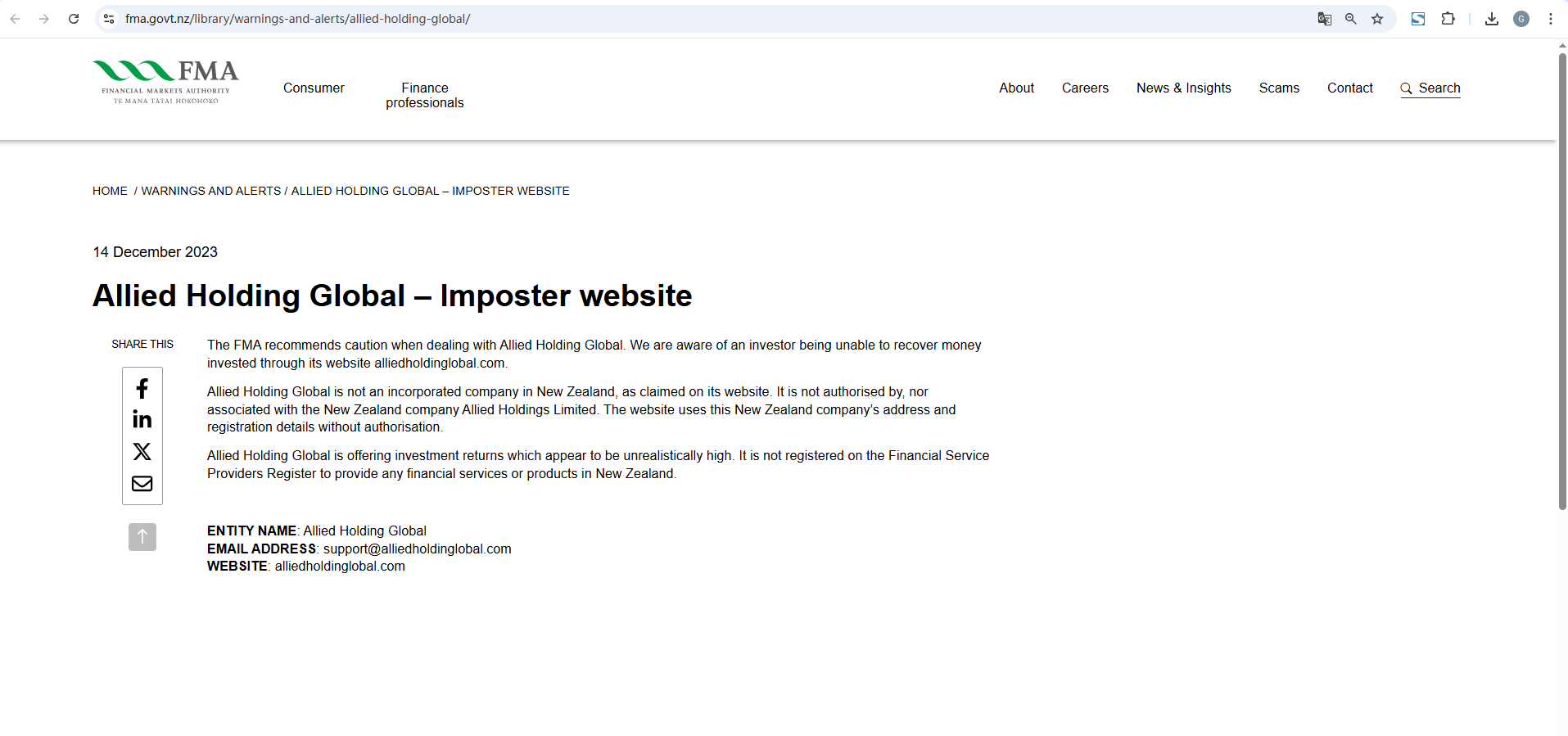 14 दिसंबर 2023 Allied Holding Global - धोखेबाज वेबसाइट इसे साझा करें एफएमए व्यवहार करते समय सावधानी बरतने की सलाह देता है Allied Holding Global हमें ज्ञात है कि एक निवेशक अपनी वेबसाइट alliedholdinglobal.com के माध्यम से निवेशित धन वापस पाने में असमर्थ रहा है। Allied Holding Global न्यूजीलैंड में एक निगमित कंपनी नहीं है, जैसा कि इसकी वेबसाइट पर दावा किया गया है। यह न्यूजीलैंड कंपनी एलाइड होल्डिंग्स लिमिटेड द्वारा अधिकृत नहीं है, न ही इसके साथ संबद्ध है। वेबसाइट बिना प्राधिकरण के इस न्यूजीलैंड कंपनी के पते और पंजीकरण विवरण का उपयोग करती है। Allied Holding Global निवेश पर मिलने वाले रिटर्न की पेशकश कर रहा है जो अवास्तविक रूप से उच्च प्रतीत होता है। यह न्यूजीलैंड में कोई भी वित्तीय सेवा या उत्पाद प्रदान करने के लिए वित्तीय सेवा प्रदाता रजिस्टर पर पंजीकृत नहीं है। इकाई का नाम: Allied Holding Global ईमेल पता: support@alliedholdinglobal.com वेबसाइट: alliedholdinglobal.com