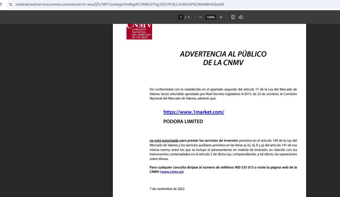 सीएनएमवी से सार्वजनिक नोटिस प्रतिभूति बाजार कानून के अनुच्छेद 17 के दूसरे खंड के प्रावधानों के अनुसार (23 अक्टूबर के रॉयल विधान डिक्री 4/2015 द्वारा अनुमोदित समेकित पाठ), राष्ट्रीय प्रतिभूति बाजार आयोग चेतावनी देता है कि: https://www. 1MARKET .com/ Podora Limited यह प्रतिभूति बाजार कानून के अनुच्छेद 140 में प्रदत्त निवेश सेवाएं तथा उसी कानून के अनुच्छेद 141 के अक्षर a), b), d), f) और g) में प्रदत्त सहायक सेवाएं प्रदान करने के लिए अधिकृत नहीं है, जिसमें उक्त कानून के अनुच्छेद 2 में परिकल्पित उपकरणों के संबंध में निवेश सलाह शामिल है, जिसमें इस प्रयोजन के लिए मुद्रा लेनदेन भी शामिल है। किसी भी प्रश्न के लिए, कृपया 900 535 015 पर कॉल करें या CNMV वेबसाइट (www.cnmv.es) पर जाएँ 7 नवंबर, 2022