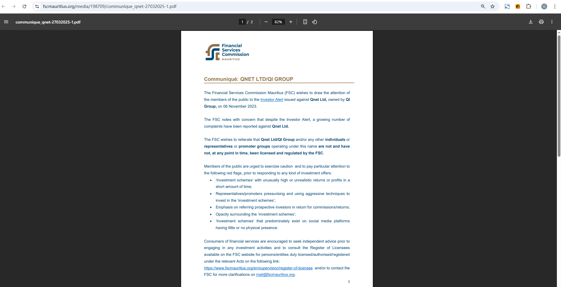 विज्ञप्ति: क्यूनेट लिमिटेड/क्यूआई ग्रुप वित्तीय सेवा आयोग मॉरीशस (एफएससी) 06 नवंबर 2023 को क्यूआई समूह के स्वामित्व वाली क्यूनेट लिमिटेड के खिलाफ जारी किए गए निवेशक अलर्ट पर जनता का ध्यान आकर्षित करना चाहता है। एफएससी चिंता के साथ नोट करता है कि निवेशक अलर्ट के बावजूद, क्यूनेट लिमिटेड के खिलाफ शिकायतों की संख्या बढ़ रही है। एफएससी यह दोहराना चाहता है कि क्यूनेट लिमिटेड/क्यूआई ग्रुप और/या इस नाम से काम करने वाले किसी भी अन्य व्यक्ति या प्रतिनिधि या प्रमोटर समूह को किसी भी समय एफएससी द्वारा लाइसेंस और विनियमित नहीं किया गया है और न ही किया गया है। जनता के सदस्यों से सावधानी बरतने और किसी भी तरह के निवेश प्रस्तावों पर प्रतिक्रिया देने से पहले निम्नलिखित लाल झंडों पर विशेष ध्यान देने का आग्रह किया जाता है: कमीशन/रिटर्न के बदले में संभावित निवेशकों को रेफर करने पर जोर; 'निवेश योजनाओं' के बारे में अस्पष्टता; 'निवेश योजनाएँ' जो मुख्य रूप से सोशल मीडिया प्लेटफ़ॉर्म पर मौजूद हैं, जिनकी भौतिक उपस्थिति बहुत कम या नहीं है। वित्तीय सेवाओं के उपभोक्ताओं को किसी भी निवेश गतिविधियों में शामिल होने से पहले स्वतंत्र सलाह लेने और संबंधित अधिनियमों के तहत विधिवत लाइसेंस प्राप्त/अधिकृत/पंजीकृत व्यक्तियों/संस्थाओं के लिए FSC वेबसाइट पर उपलब्ध लाइसेंसधारियों के रजिस्टर से परामर्श करने के लिए प्रोत्साहित किया जाता है: https://www.fscmauritius.org/en/supervision/register-of-licensee और/या अधिक स्पष्टीकरण के लिए mail@fscmauritius.org पर FSC से संपर्क करें।