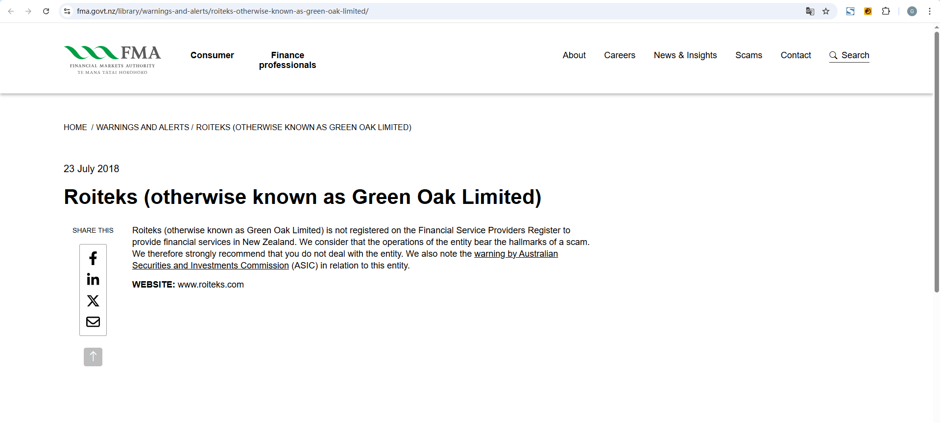 घरेलू चेतावनियाँ और अलर्ट ROITEKS (अन्य नाम ग्रीन ओक लिमिटेड) 23 जुलाई 2018 ROITEKS (अन्यथा ग्रीन ओक लिमिटेड के रूप में जाना जाता है) इसे साझा करें ROITEKS (अन्यथा ग्रीन ओक लिमिटेड के रूप में जाना जाता है) न्यूजीलैंड में वित्तीय सेवाएं प्रदान करने के लिए वित्तीय सेवा प्रदाता रजिस्टर पर पंजीकृत नहीं है। हम मानते हैं कि इकाई के संचालन में घोटाले के लक्षण हैं। इसलिए हम दृढ़ता से अनुशंसा करते हैं कि आप इकाई के साथ सौदा न करें। हम इस इकाई के संबंध में ऑस्ट्रेलियाई प्रतिभूति और निवेश आयोग (ASIC) द्वारा दी गई चेतावनी को भी ध्यान में रखते हैं। वेबसाइट: www. ROITEKS .कॉम