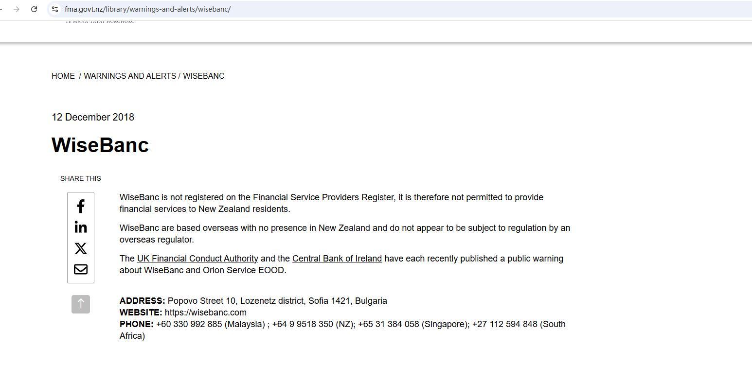 12 दिसंबर 2018 वाइजबैंक इसे शेयर करें वाइजबैंक फाइनेंशियल सर्विस प्रोवाइडर्स रजिस्टर में पंजीकृत नहीं है, इसलिए यह न्यूजीलैंड के निवासियों को वित्तीय सेवाएं प्रदान करने के लिए अनुमति प्राप्त नहीं है। वाइजबैंक विदेश में स्थित है और न्यूजीलैंड में इसकी कोई उपस्थिति नहीं है तथा यह किसी विदेशी नियामक द्वारा विनियमित होता हुआ प्रतीत नहीं होता है। यूके फाइनेंशियल कंडक्ट अथॉरिटी और सेंट्रल बैंक ऑफ आयरलैंड ने हाल ही में वाइजबैंक और ओरियन सर्विस ईओओडी के बारे में एक सार्वजनिक चेतावनी जारी की है। पता: पोपोवो स्ट्रीट 10, लोज़ेनेट्स जिला, सोफिया 1421, बुल्गारिया वेबसाइट: https://wisebanc.com फोन: +60 330 992 885 (मलेशिया); +64 9 9518 350 (एनजेड); +65 31 384 058 (सिंगापुर); +27 112 594 848 (दक्षिण अफ्रीका).
