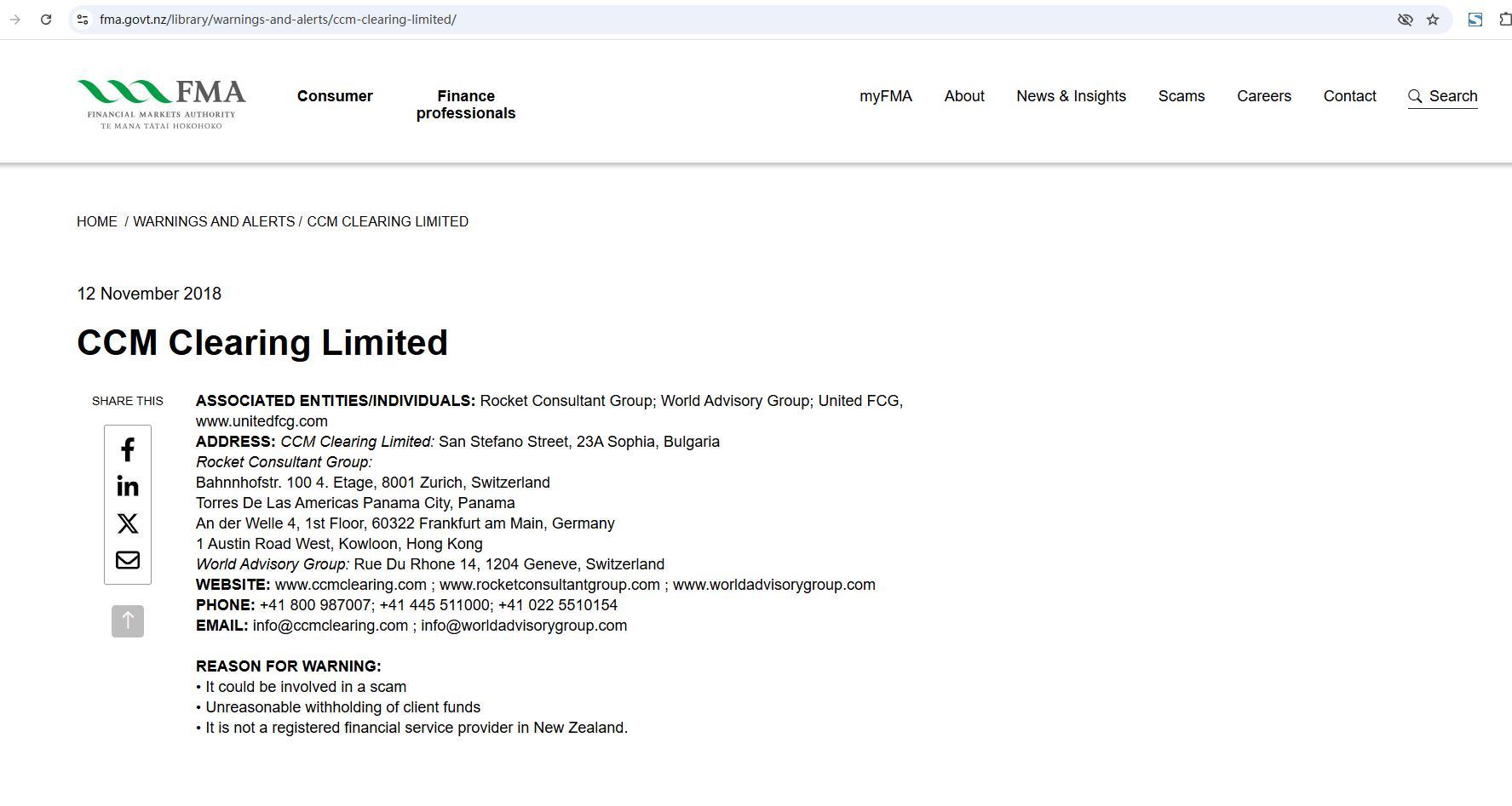 12 नवंबर 2018 CCM Clearing लिमिटेड इसे साझा करें संबद्ध संस्थाएं/व्यक्ति: रॉकेट कंसल्टेंट ग्रुप; वर्ल्ड एडवाइजरी ग्रुप; यूनाइटेड एफसीजी, www.unitedfcg.com पता: CCM Clearing लिमिटेड: सैन स्टेफानो स्ट्रीट, 23ए सोफिया, बुल्गारिया रॉकेट कंसल्टेंट ग्रुप: बहनहोफस्ट्र. 100 4. एटेज, 8001 ज्यूरिख, स्विटजरलैंड टोरेस डी लास अमेरिकास पनामा सिटी, पनामा एन डेर वेले 4, पहली मंजिल, 60322 फ्रैंकफर्ट एम मेन, जर्मनी 1 ऑस्टिन रोड वेस्ट, कॉव्लून, हांगकांग वर्ल्ड एडवाइजरी ग्रुप: रुए डू रोन 14, 1204 जिनेवा, स्विटजरलैंड वेबसाइट: www.ccmclearing.com ; www.rocketconsultantgroup.com ; www.worldadvisorygroup.com फ़ोन: +41 800 987007; +41 445 511000; +41 022 5510154 ईमेल: info@ccmclearing.com ; info@worldadvisorygroup.com चेतावनी का कारण: • यह किसी घोटाले में शामिल हो सकता है • क्लाइंट के पैसे को अनुचित तरीके से रोककर रखना • यह एक पंजीकृत वित्तीय सेवा प्रदाता नहीं है न्यूज़ीलैंड।