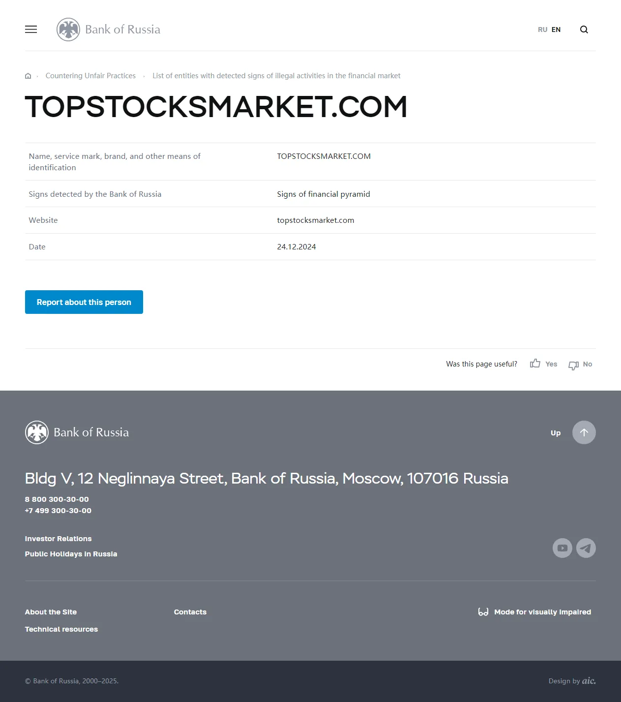 नाम, सर्विस मार्क, ब्रांड और अन्य पहचान के तरीके TOPSTOCKSMARKET.COM रूसी बैंक द्वारा पहचाने गए संकेत फ़ाइनेंशियल पिरामिड के संकेत वेबसाइट topstocksmarket.com दिनांक 24.12.2024.