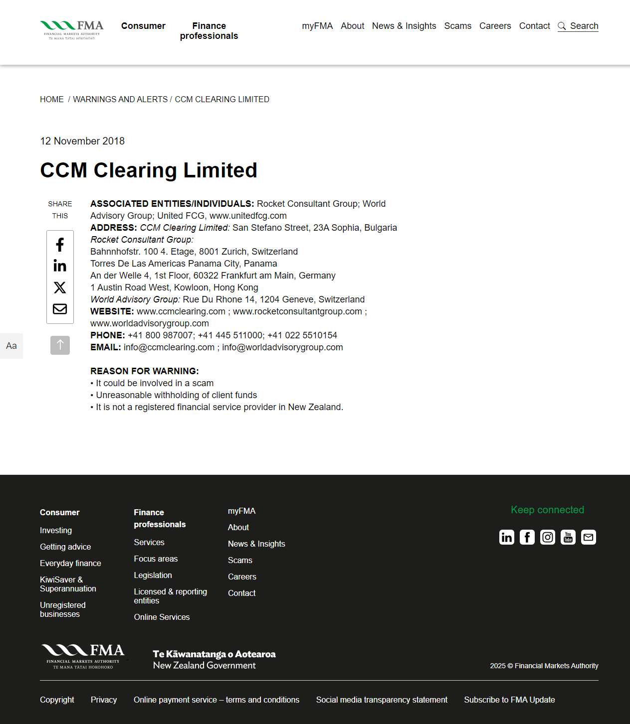 संबद्ध संस्थाएँ/व्यक्ति: रॉकेट कंसल्टेंट ग्रुप; वर्ल्ड एडवाइजरी ग्रुप; यूनाइटेड एफसीजी, www.unitedfcg.comA पता: CCM Clearing लिमिटेड: सैन स्टेफानो स्ट्रीट, 23ए सोफिया, बुल्गारिया रॉकेट कंसल्टेंट ग्रुप: बहनहोफस्ट्र. 100 4. एटेज, 8001 ज्यूरिख, स्विट्जरलैंड टोरेस डी लास अमेरिकास पनामा सिटी, पनामा एन डेर वेले 4, पहली मंजिल, 60322 फ्रैंकफर्ट एम मेन, जर्मनी 1 ऑस्टिन रोड वेस्ट, कॉव्लून, हांगकांग वर्ल्ड एडवाइजरी ग्रुप: रुए डू रोन 14, 1204 जिनेवा, स्विट्जरलैंड वेबसाइट: www.ccmclearing.com ; www.rocketconsultantgroup.com ; www.worldadvisorygroup.com फ़ोन: +41 800 987007; +41 445 511000; +41 022 5510154ईमेल: info@ccmclearing.com ; info@worldadvisorygroup.com चेतावनी का कारण:• यह किसी घोटाले में शामिल हो सकता है• ग्राहक के धन को अनुचित रूप से रोके रखना• यह न्यूज़ीलैंड में पंजीकृत वित्तीय सेवा प्रदाता नहीं है। .
