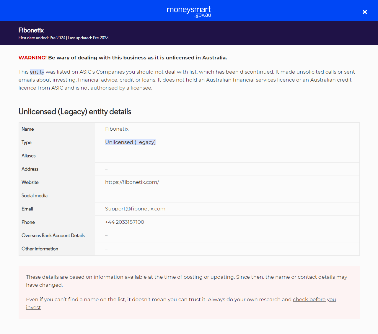 निवेशक चेतावनी सूचीFibonetix.