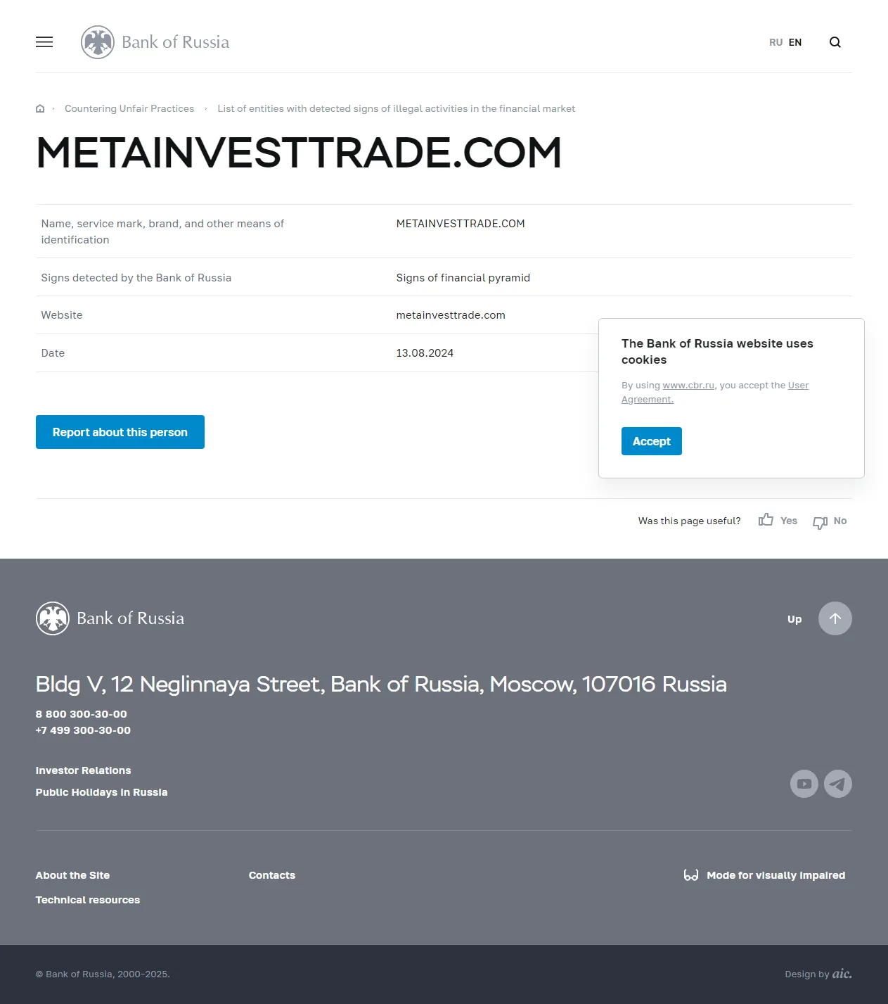 नाम, सेवा चिह्न, ब्रांड और पहचान के अन्य साधन METAINVESTTRADE.COM रूस के बैंक द्वारा पहचाने गए संकेत वित्तीय पिरामिड के संकेत वेबसाइट metainvesttrade.com तारीख 13.08.2024.