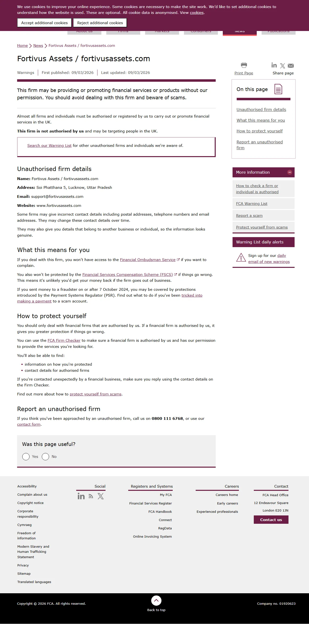 अनधिकृत फर्मों की एफसीए चेतावनी सूची फोर्टिवस एसेट्स / fortivusassets.com.