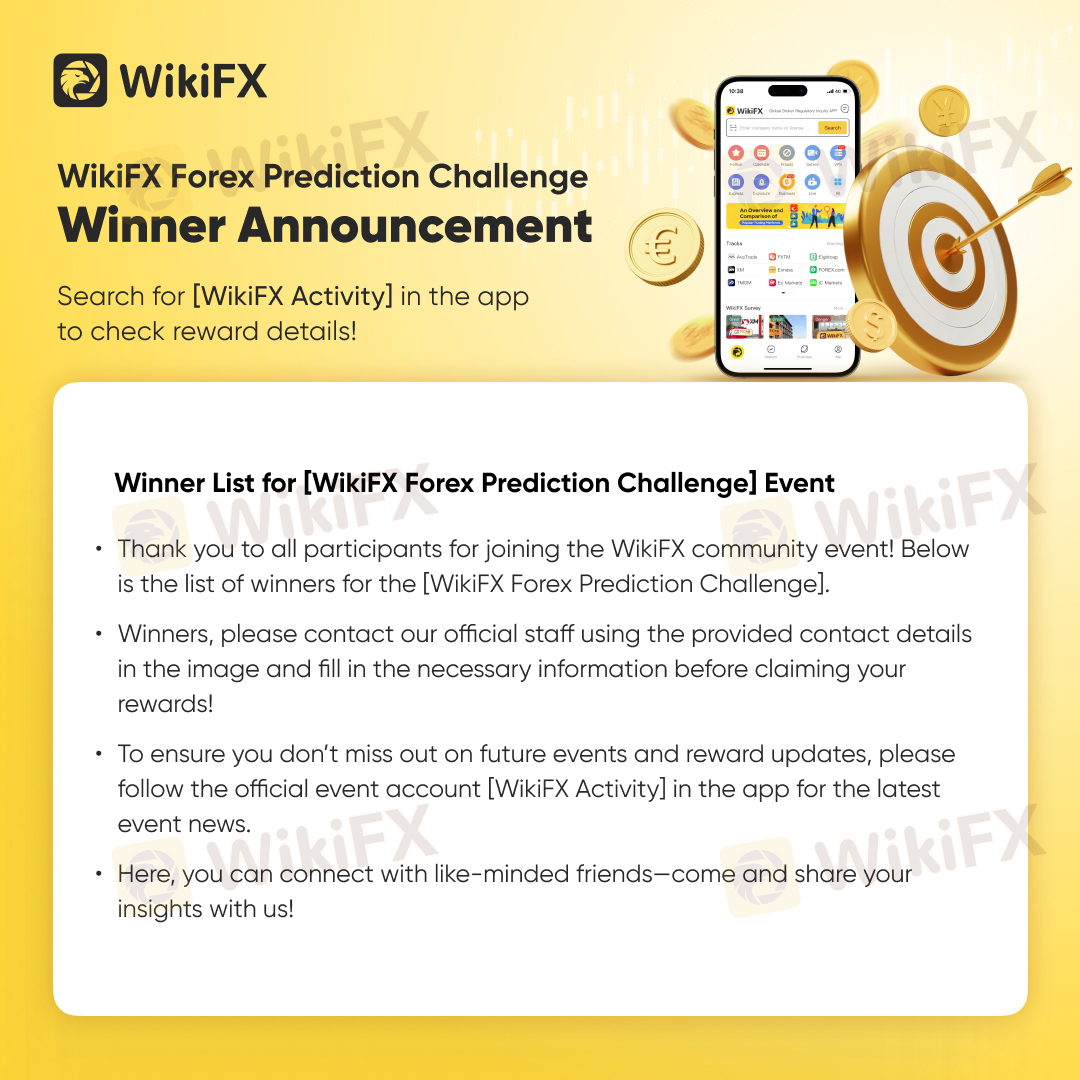 Winner List for [WikiFX Forex Prediction Challenge] EventThank you to all participants for joining the WikiFX community event! Below is the list of winners for the [WikiFX Forex Prediction Challenge].Winners, please contact our official staff using the provided contact details in the image and fill in the necessary information before claiming your rewards!To ensure you don’t miss out on future events and reward updates, please follow the official event account [WikiFX Activity] in the app for the latest event news.Here, you can connect with like-minded friends—come and share your insights with us!
