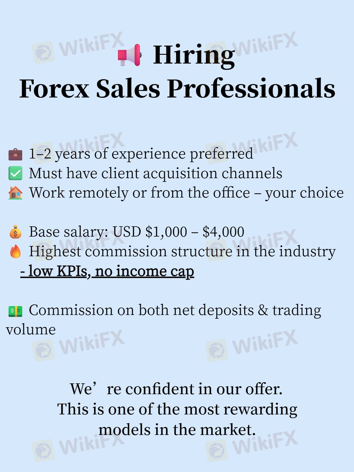 💼 1–2 years of experience preferred ✅ Must have client acquisition channels 🏠 Work remotely or from the office – your choice 💰 Base salary: USD $1,000 – $4,000 🔥 Highest commission structure in the industry - low KPIs, no income cap 💵 Commission on both net deposits & trading volume We’re confident in our offer — this is one of the most rewarding models in the market. 📩 DM me to know more.