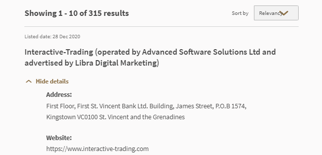 "निवेशक अलर्ट सूची निवेशक अलर्ट सूची उन लोगों की सूची प्रदान करती है, जो मास को उपलब्ध जानकारी के आधार पर, i) गलत तरीके से लाइसेंस प्राप्त होने या किसी अन्य तरीके से मास द्वारा अधिकृत या विनियमित होने के रूप में माना जा सकता है या हो सकता है; ii) बनाया है व्यापारिक न्यास या सामूहिक निवेश योजना में यूनिटों का प्रस्ताव जिसे मास द्वारा प्राधिकृत, मान्यता प्राप्त या पंजीकृत होने के रूप में गलत तरीके से समझा जा सकता है या माना जा सकता है; iii) निवेश का प्रस्ताव दिया है जिसे गलत तरीके से माना जा सकता है या हो सकता है मास में दर्ज या पंजीकृत किसी दस्तावेज़ के साथ या उसके साथ। यह सूची संपूर्ण नहीं है और प्रकाशन के समय मास को जो ज्ञात था, उस पर आधारित है। सूचीबद्ध तिथि: 28 दिसंबर 2020 Interactive-trading (द्वारा संचालित किया गया Advanced Software Solutions Ltd और लिब्रा डिजिटल मार्केटिंग द्वारा विज्ञापित) विवरण छुपाएं पता: पहली मंजिल, पहली सेंट। विन्सेंट बैंक लिमिटेड बिल्डिंग, जेम्स स्ट्रीट, पीओबी 1574, किंग्सटाउन वीसी0100 सेंट। विन्सेंट और ग्रेनेडाइंस वेबसाइट: https://www. Interactive-trading .com