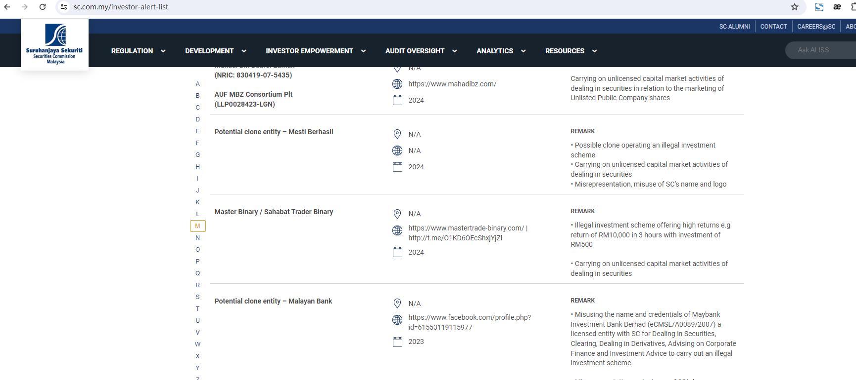 "इस अनुभाग में अनधिकृत वेबसाइटों, निवेश उत्पादों, कंपनियों और व्यक्तियों की सूची शामिल है। इस सूची में शामिल हैं: एससी से लाइसेंस के बिना निम्नलिखित विनियमित गतिविधियों को करने वाले या खुद को संचालित करने वाले व्यक्ति: प्रतिभूतियों में लेनदेन; डेरिवेटिव में लेनदेन; फंड प्रबंधन; कॉर्पोरेट वित्त पर सलाह देना; निवेश सलाह; वित्तीय नियोजन; और निजी सेवानिवृत्ति योजनाओं में काम करना। प्राधिकरण के बिना किसी मान्यता प्राप्त बाजार का संचालन करने वाले व्यक्ति। अनुमोदन, प्राधिकरण या मान्यता के बिना प्रतिभूतियां जारी करने या पेश करने वाले व्यक्ति। एससी के लोगो का दुरुपयोग करने वाले और एससी को गलत तरीके से प्रस्तुत करने वाले व्यक्ति। " Master Binary https://www. Mastertrade-Binary.Com 2024 • उच्च रिटर्न की पेशकश करने वाली अवैध निवेश योजना, उदाहरण के लिए आरएम500 के निवेश के साथ 3 घंटे में आरएम10,000 का रिटर्न • प्रतिभूतियों में लेनदेन की बिना लाइसेंस वाली पूंजी बाजार गतिविधियों को अंजाम देना