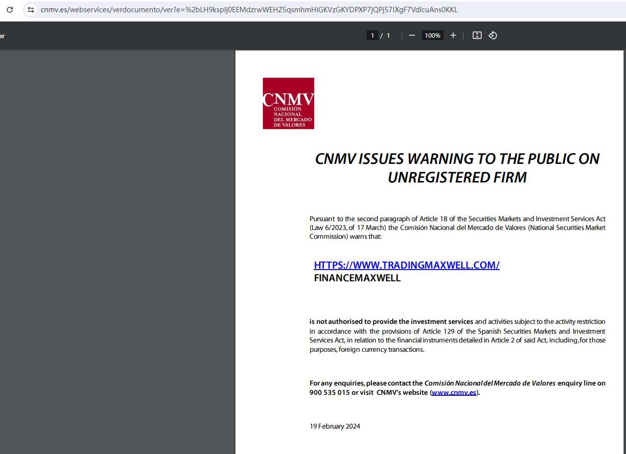 सीएनएमवी ने प्रतिभूति बाजार और निवेश सेवा अधिनियम (17 मार्च के कानून 6/2023) के अनुच्छेद 18 के दूसरे पैराग्राफ के अनुसार अपंजीकृत फर्म पर जनता को चेतावनी जारी की है, कॉमिसियन नैशनल डेल मर्काडो डी वेलोरेस (राष्ट्रीय प्रतिभूति बाजार आयोग) ने चेतावनी दी है कि : HTTPS://WWW.TRADINGMAXWELL.COM/ फाइनेंसमैक्सवेल वित्तीय के संबंध में स्पेनिश प्रतिभूति बाजार और निवेश सेवा अधिनियम के अनुच्छेद 129 के प्रावधानों के अनुसार गतिविधि प्रतिबंध के अधीन निवेश सेवाएं और गतिविधियां प्रदान करने के लिए अधिकृत नहीं है। उक्त अधिनियम के अनुच्छेद 2 में विस्तृत उपकरण, जिनमें उन उद्देश्यों के लिए विदेशी मुद्रा लेनदेन शामिल हैं। किसी भी पूछताछ के लिए, कृपया 900 535 015 पर कोमिसियोन नैशनल डेल मर्काडो डी वेलोरेस पूछताछ लाइन से संपर्क करें या सीएनएमवी की वेबसाइट (www.cnmv.es) पर जाएं। 19 फरवरी 2024