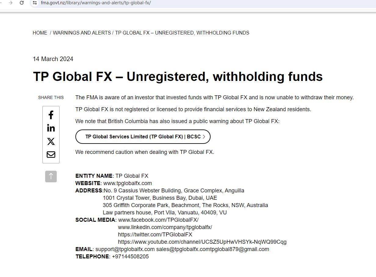 • सजा का कारण TP Global FXन्यूजीलैंड निवासियों को वित्तीय सेवाएं प्रदान करने के लिए पंजीकृत या लाइसेंस प्राप्त नहीं है।