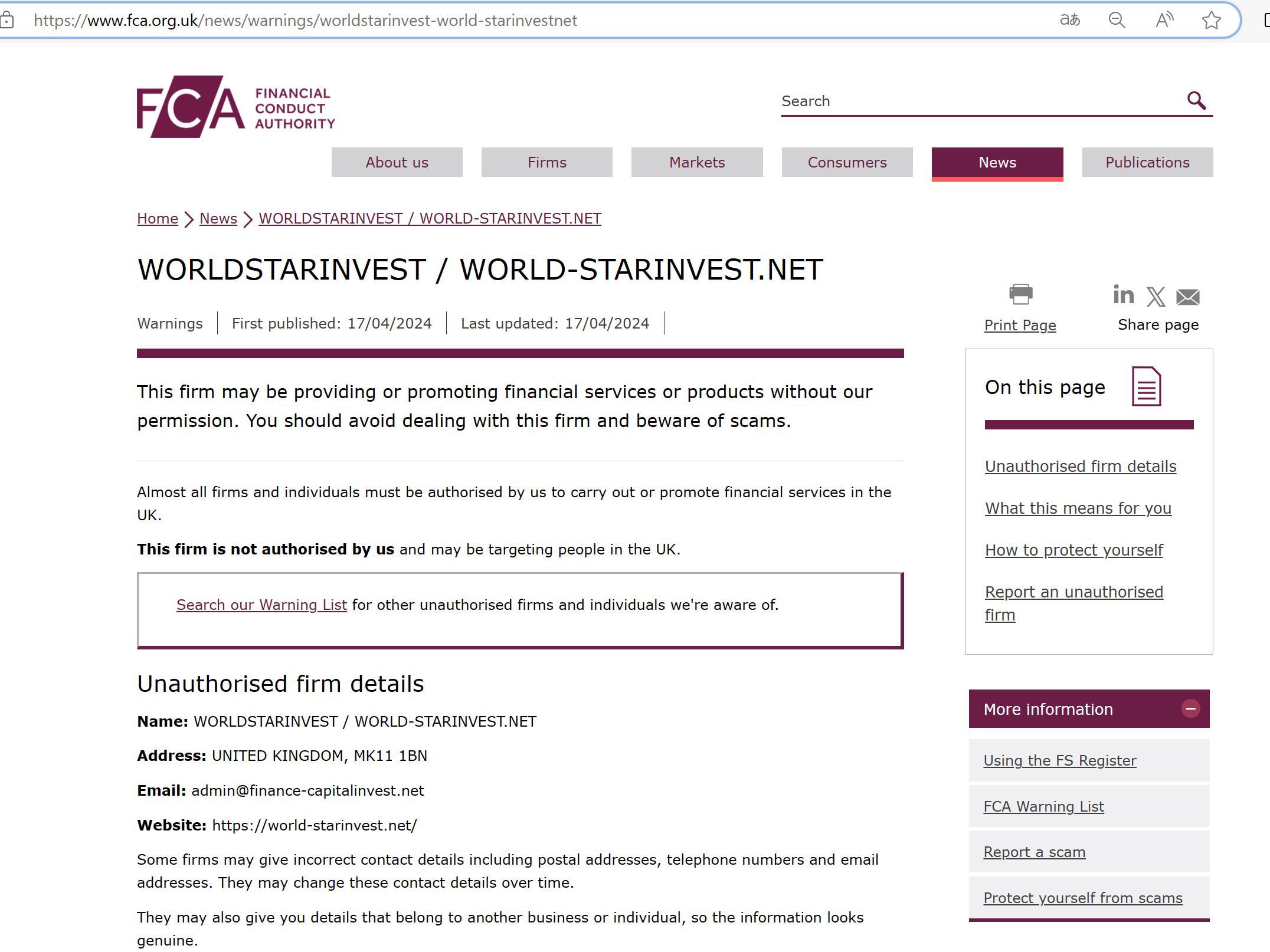FCA अनधिकृत फर्मों की चेतावनी सूची WORLDSTARINVEST.