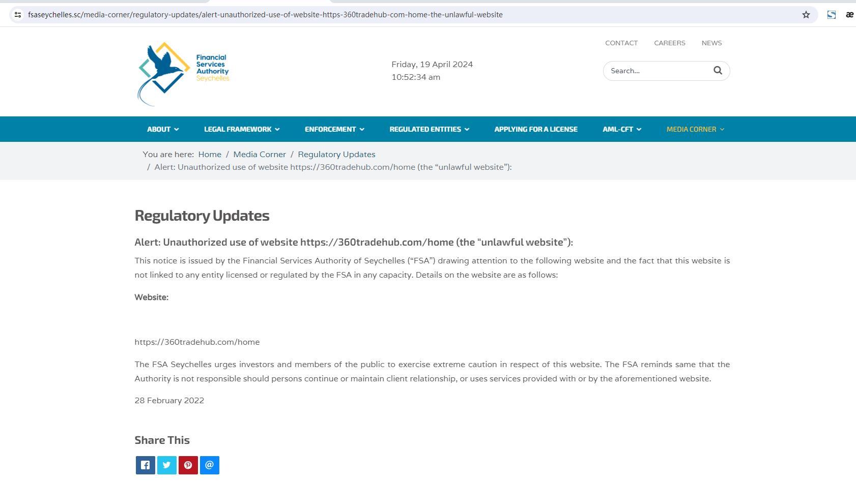 विनियामक अपडेट अलर्ट: वेबसाइट https://360tradehub.com/home ("अवैध वेबसाइट") का अनधिकृत उपयोग: यह नोटिस सेशेल्स के वित्तीय सेवा प्राधिकरण ("FSA") द्वारा जारी किया गया है, जो निम्नलिखित वेबसाइट और इस तथ्य की ओर ध्यान आकर्षित करता है कि यह वेबसाइट किसी भी क्षमता में FSA द्वारा लाइसेंस प्राप्त या विनियमित किसी भी इकाई से जुड़ी नहीं है। वेबसाइट पर विवरण इस प्रकार हैं: वेबसाइट: https://360tradehub.com/home FSA सेशेल्स निवेशकों और जनता के सदस्यों से इस वेबसाइट के संबंध में अत्यधिक सावधानी बरतने का आग्रह करता है। FSA उन्हें याद दिलाता है कि यदि व्यक्ति क्लाइंट संबंध जारी रखते हैं या बनाए रखते हैं, या उपर्युक्त वेबसाइट के साथ या उसके द्वारा प्रदान की गई सेवाओं का उपयोग करते हैं, तो प्राधिकरण जिम्मेदार नहीं होगा। 28 फरवरी 2022