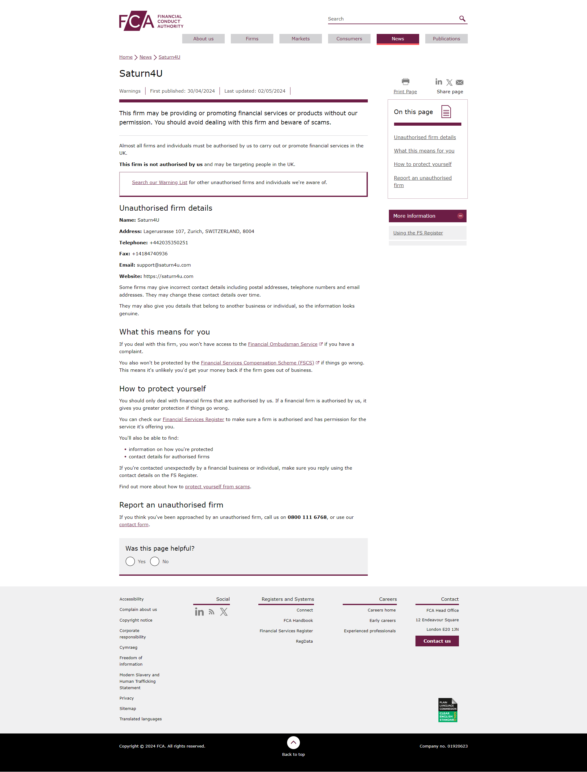 FCA द्वारा अधिकृत नहीं कंपनियों की चेतावनी सूची सैटर्न4यू.