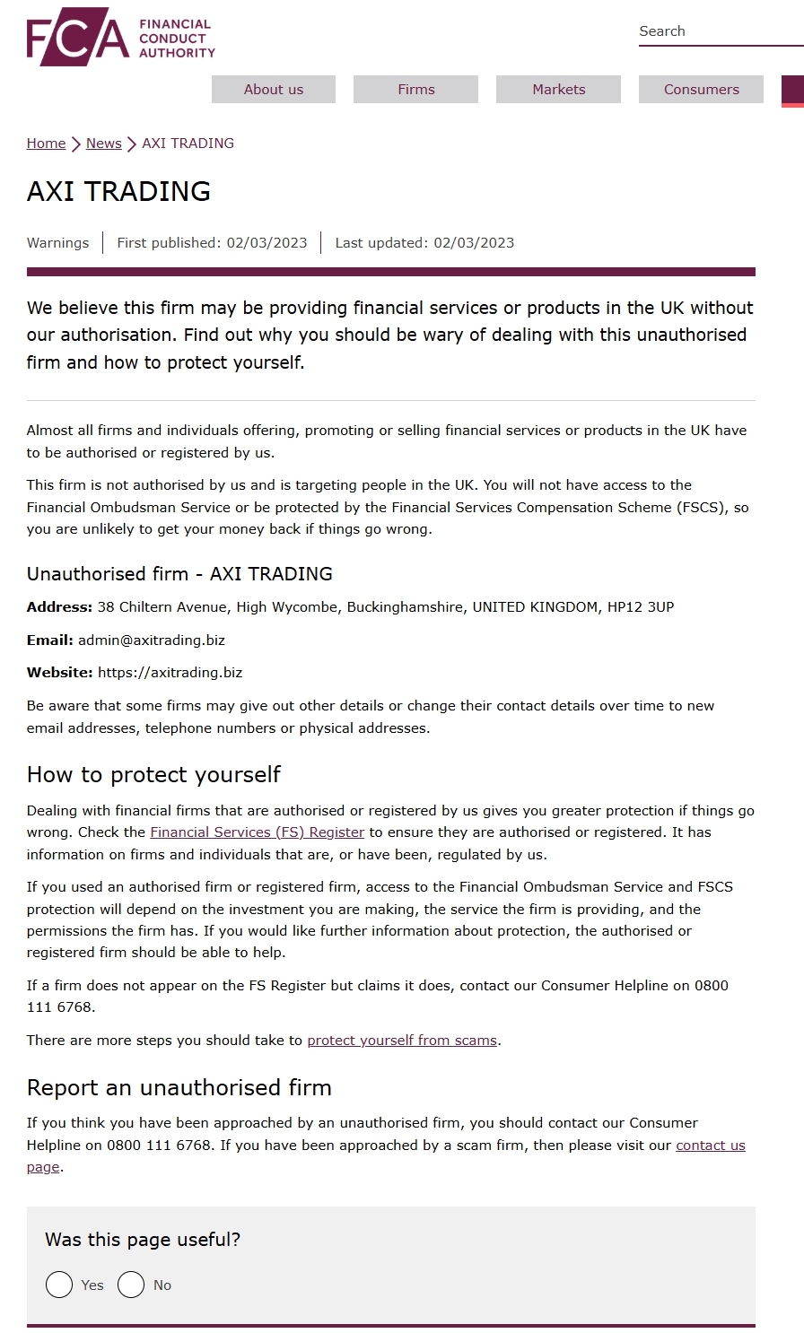एफसीए की अनधिकृत फर्मों की चेतावनी सूची एएक्सआई ट्रेडिंग.