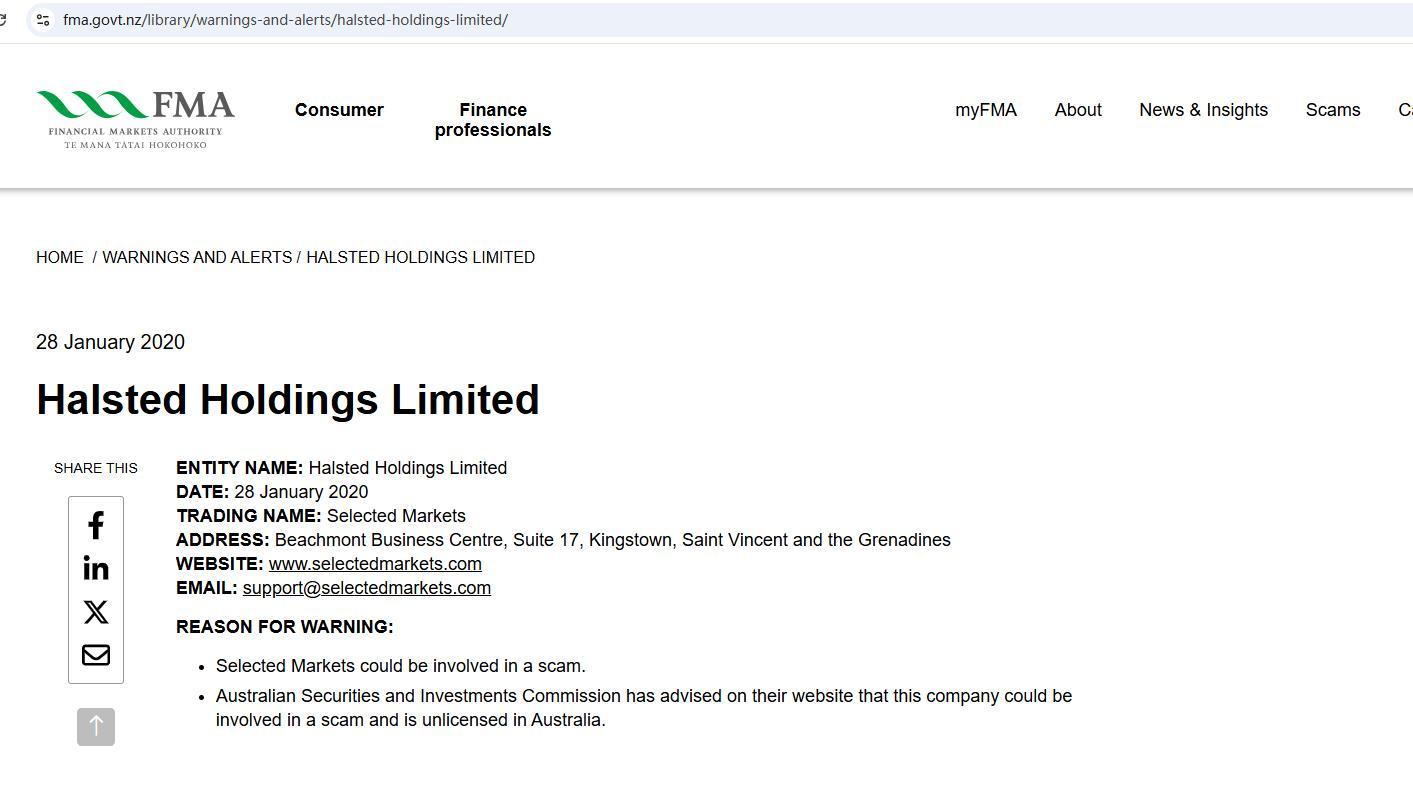 • सजा का कारण Selected Marketsयह कंपनी किसी घोटाले में शामिल हो सकती है। ऑस्ट्रेलियाई प्रतिभूति और निवेश आयोग ने अपनी वेबसाइट पर सलाह दी है कि यह कंपनी किसी घोटाले में शामिल हो सकती है और ऑस्ट्रेलिया में इसका कोई लाइसेंस नहीं है।