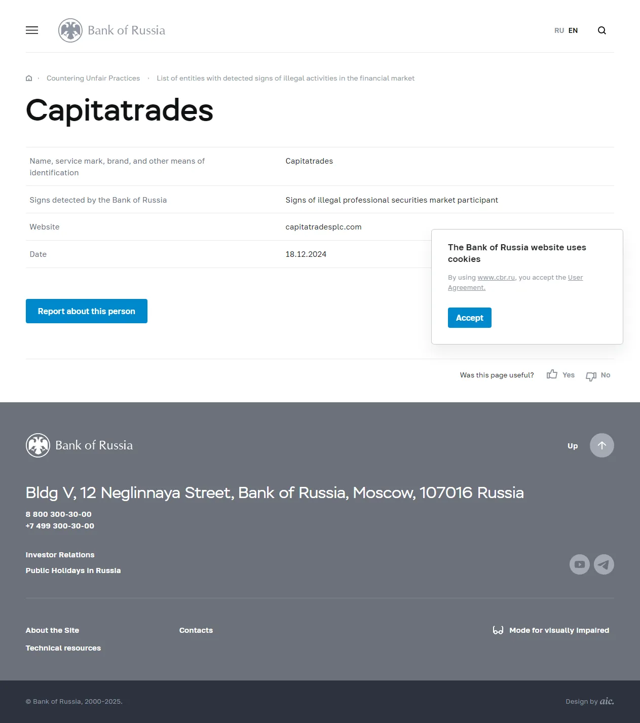 नाम, सेवा चिह्न, ब्रांड और पहचान के अन्य साधन Capitatrades रूस के बैंक द्वारा पहचाने गए संकेत अवैध पेशेवर प्रतिभूति बाजार प्रतिभागी के संकेत वेबसाइट capitatradesplc.com तिथि 18.12.2024.