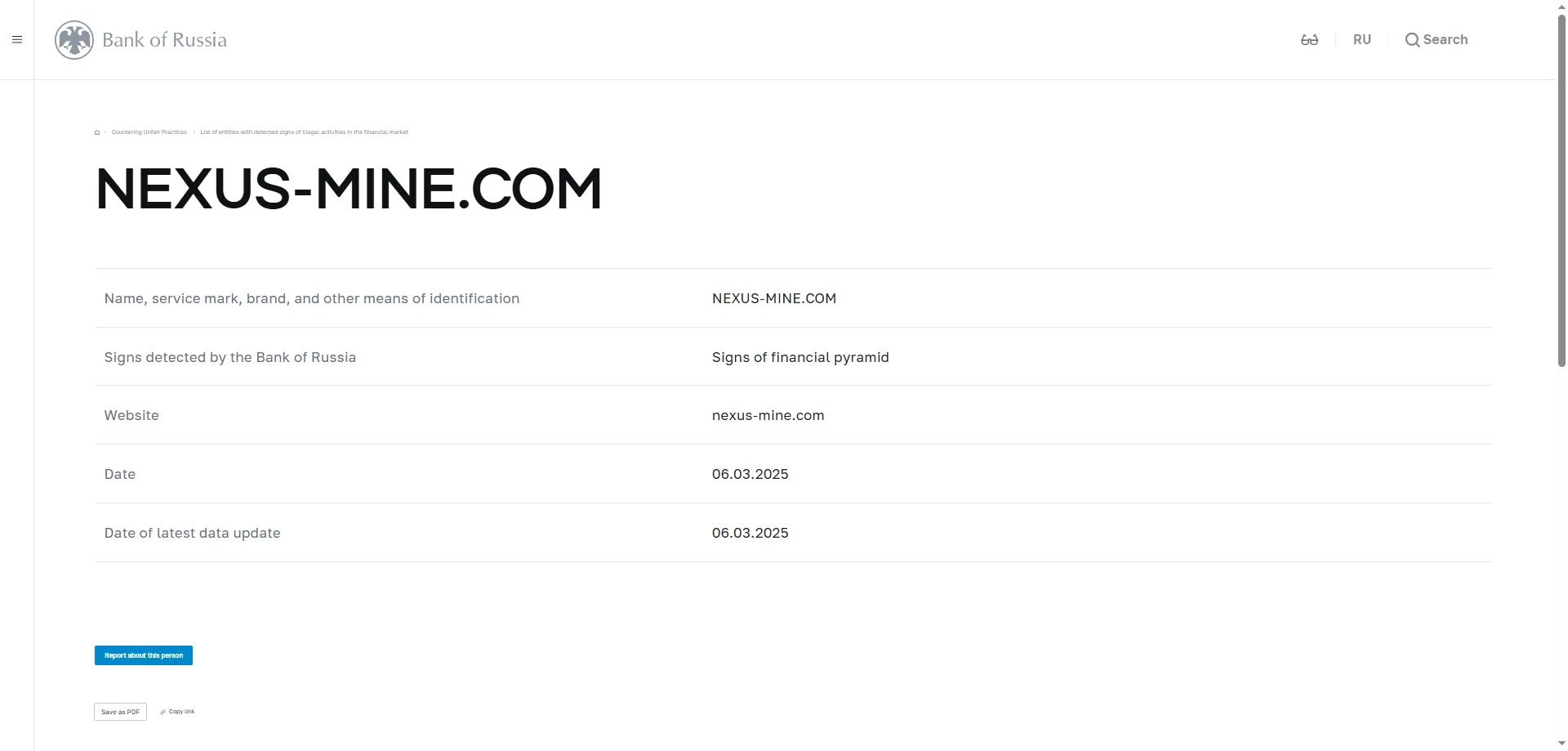 नाम, सेवा चिह्न, ब्रांड और पहचान के अन्य साधन NEXUS-MINE.COM रूसी बैंक द्वारा पहचाने गए संकेत वित्तीय पिरामिड के संकेत वेबसाइट nexus-mine.com तिथि 06.03.2025 नवीनतम डेटा अद्यतन की तिथि 06.03.2025.