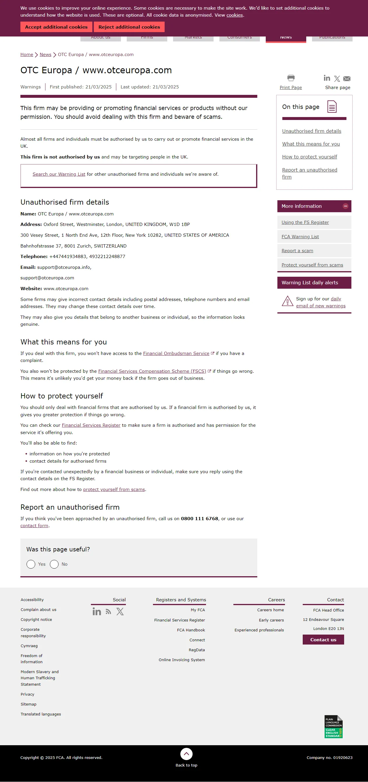 FCA की अनाधिकृत फर्मों की चेतावनी सूची OTC Europa / www.otceuropa.com.