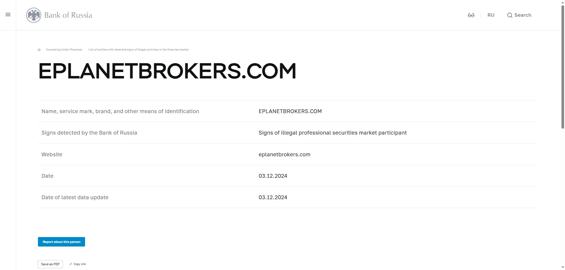 वित्तीय बाजार EPLANETBROKERS.COM में अवैध गतिविधियों के संकेतों का पता चलने वाली संस्थाओं की सूची.