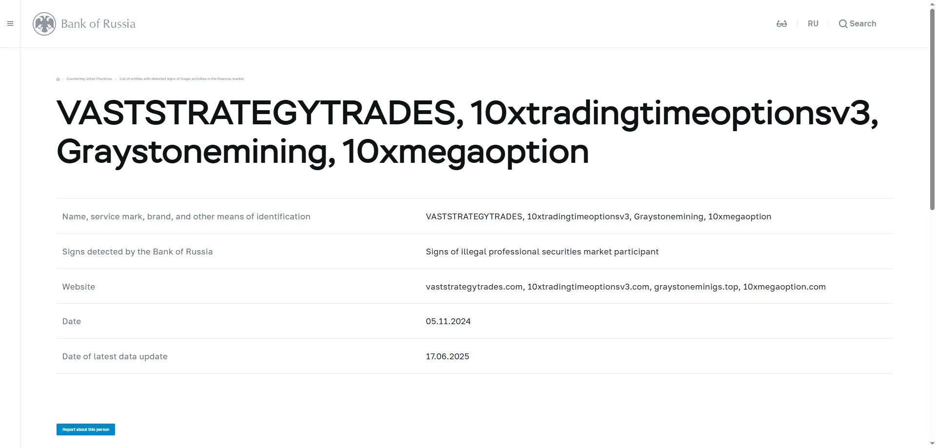 वित्तीय बाजार में अवैध गतिविधियों के संकेतों के साथ संस्थाओं की सूची VASTSTRATEGYTRADES, 10xtradingtimeoptionsv3, Graystonemining, 10xmegaoption.