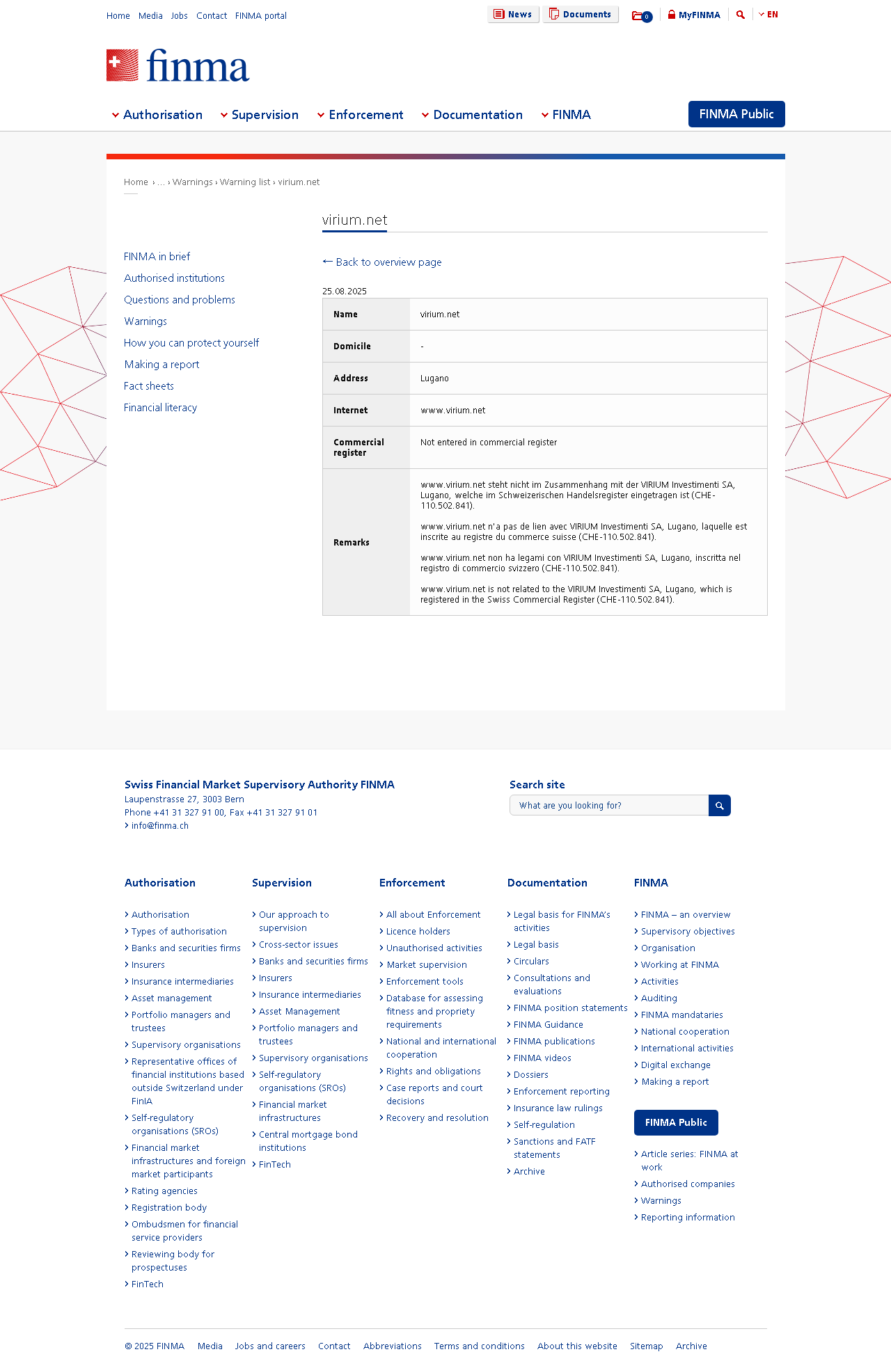 सार्वजनिक चेतावनी उन कंपनियों और व्यक्तियों की चेतावनी सूची जो अनधिकृत सेवाएं प्रदान कर रहे हों और FINMAvirium.net द्वारा पर्यवेक्षित नहीं हैं.