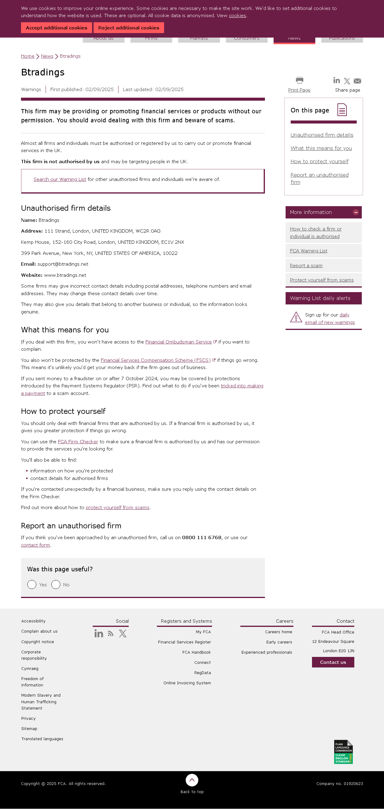 FCA की अनधिकृत फर्मों की चेतावनी सूची Btradings.