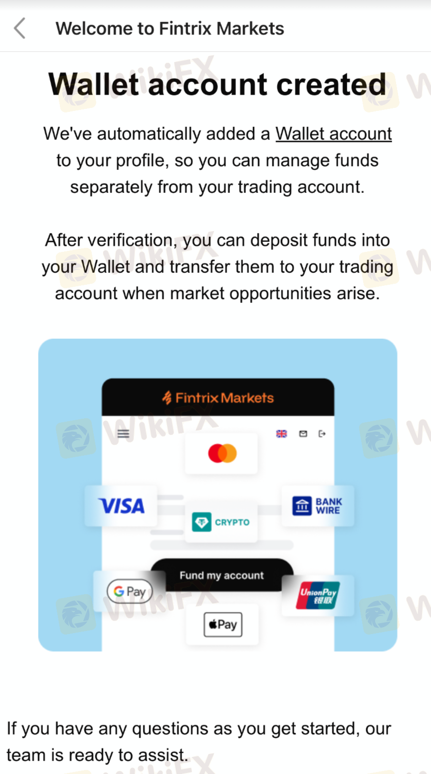Fintrix Markets menyediakan berbagai pilihan pembayaran global dan lokal, termasuk Visa/Mastercard, Apple Pay, Google Pay, transfer bank, dan cryptocurrency. Perusahaan menekankan proses yang lancar, mengklaim setoran instan dan akses transaksi 24/7.