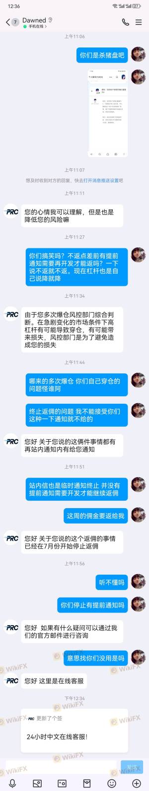 Kami telah melakukan perdagangan di platform ini selama lebih dari sepuluh tahun. Orang yang bertanggung jawab atas platform ini bernama Ito, yang merupakan orang Tiongkok dengan kewarganegaraan Jepang. Tahun lalu, kami memiliki klien utama yang mendepositokan dana di platform ini untuk melakukan perdagangan Indeks Dow Jones. Saat mendepositokan dana, sebagai agen, kami secara khusus menghubungi Ito, orang yang bertanggung jawab atas platform ini, untuk mengonfirmasi apakah platform Prc dapat menjamin keamanan penarikan dana klien. Ito berkali-kali meyakinkan kami bahwa tidak akan ada masalah. Namun, ketika klien menghasilkan keuntungan sebesar $1,13 juta, mereka menolak untuk menarik dana dan secara paksa menutup akun klien, dengan alasan bahwa klien telah melanggar aturan. Yang lebih memalukan adalah bahwa mereka bahkan menolak membayar komisi kami sebesar $18.963 (saya telah mengunggah catatan dari backend agen saya dan percakapan WeChat dengan Ito, orang yang bertanggung jawab atas Prc). Sudah hampir setahun sekarang. Ketika menghubungi layanan pelanggan mereka dan Ito, orang yang bertanggung jawab atas Prc, mereka memblokir dan memasukkan saya dalam daftar hitam. Platform ini tidak memiliki pasar lindung nilai. Ini adalah platform hitam. Pelanggan yang masih melakukan perdagangan di platform ini harus sangat berhati-hati. Platform ini mengincar modal Anda. Saat melakukan perdagangan di platform ini, pelanggan harus tetap waspada. Jangan biarkan antusiasme layanan pelanggan platform mengaburkan penilaian Anda tentang dana Anda. Perilaku tidak etis dari platform ini telah melampaui batas hukum, yang hanya merupakan bentuk lain dari penipuan. Mereka menipu modal awal pelanggan dan kemudian mengembangkan pelanggan baru, dan personel layanan pelanggan seringkali mengubah nomor WeChat dan QQ mereka.