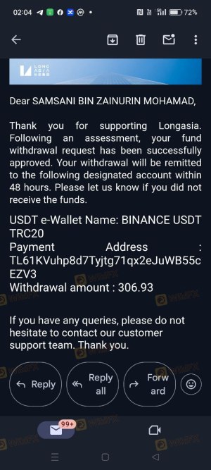 KEPADA PIHAK LONGASIA, SAYA BARU SAJA MENGIRIM PESAN MELALUI SUREL (support@longasiagroups.com) TANGGAL PENARIKAN PERTAMA SAYA PADA (27/11/2023) SUDAH TERLALU LAMA TIDAK MASUK KE DOMPET HINGGA SAAT INI, DAN SAYA SUDAH MENGIRIM PERTANYAAN TETAPI JAWABAN DARI PIHAK LONGASIA PADA 3/7/2024 JUMLAH USD306.93 HANYA MENJAWAB TENTANG PENARIKAN SAYA YANG SUDAH SAYA LAPORKAN KE LONGASIA UNTUK WAKTU YANG LAMA, KARENA LONGASIA MENGATAKAN 3 HARI KERJA TETAPI HINGGA SAAT INI BELUM MASUK KE DOMPET TRC20 SAYA, SAYA TELAH MENUNGGU SELAMA 7 HARI TUAN / NYONYA ... MOHON PERHATIAN ATAU KERJASAMA, KARENA SAYA MEMOHON UNTUK MENGGUNAKAN UANG SEBAGAI KEADAAN DARURAT, MOHON MOHON ... TERIMA KASIH.